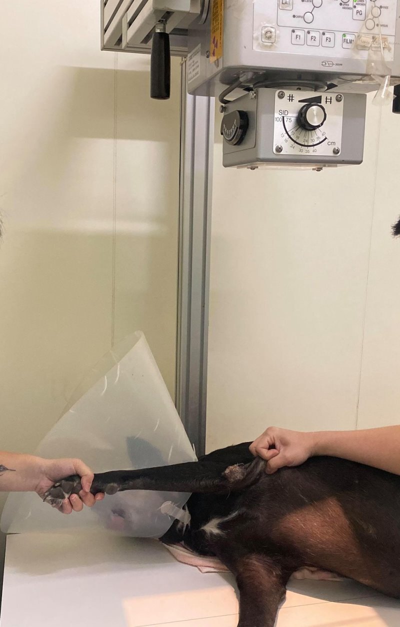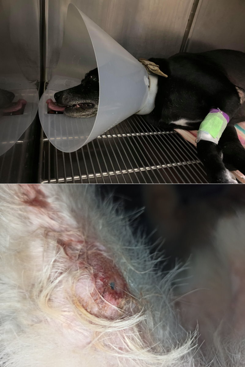 養了兩年多沒有任何人可以摸到她,近兩個月出現行動困難現象,還腫脹起一塊肉瘤,故麻煩狗志工共同圍捕,才順利就醫。