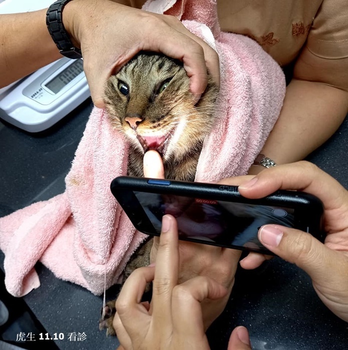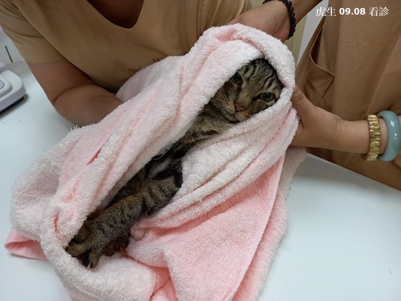 虎生是協會接獲民眾通報後於109年4月26日在永和區救援的貓咪,救援送醫檢查後發現屁股有很多處傷口,疑似是被咬傷且都已化膿,口腔檢查有嚴重口炎、化膿、增生組織、牙齒鬆動,舌下有腫塊,血檢結果愛滋陽性,腎指數高、貧血,辦理住院治療清創傷口、打點滴吃藥、打造血針,住院近一個月後,傷口已恢復得不錯,即辦理出院住進安養之家照護,後於5月28日進行牙周手術,進行全口拔牙,術後開始施打干擾素及服用類固醇治療口炎,因類固醇的影響,血糖指數升高也開始吃乳鉻治療,並定期回診檢查口腔及血糖情況。