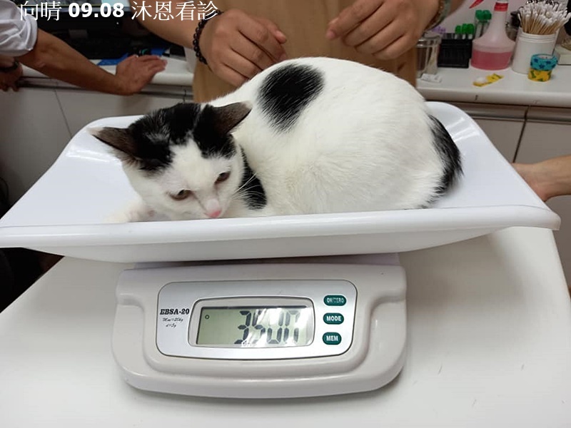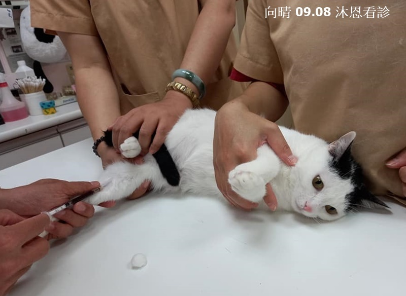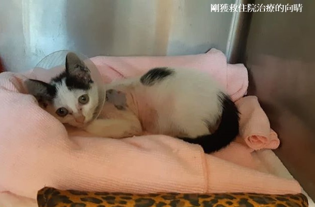向晴是2019年9月初協會志工接獲通報後前往救援的小貓咪,當時疑似被咬傷,左肩胛上有一個化膿傷口,救援後送醫住院清創、進行細菌培養、驅蟲,送驗抗核抗體檢驗結果指數很高,表示有自體免疫的問題,住院近三周後已較為穩定便出院住進安養之家,當時須每天打泰寧抗生素針,出院半個月後突然發現精神食慾變差,回診檢查發現肩胛骨有破洞及碎骨,又再進行左肩胛探查手術將碎骨取出,術後住院觀察三日出院。