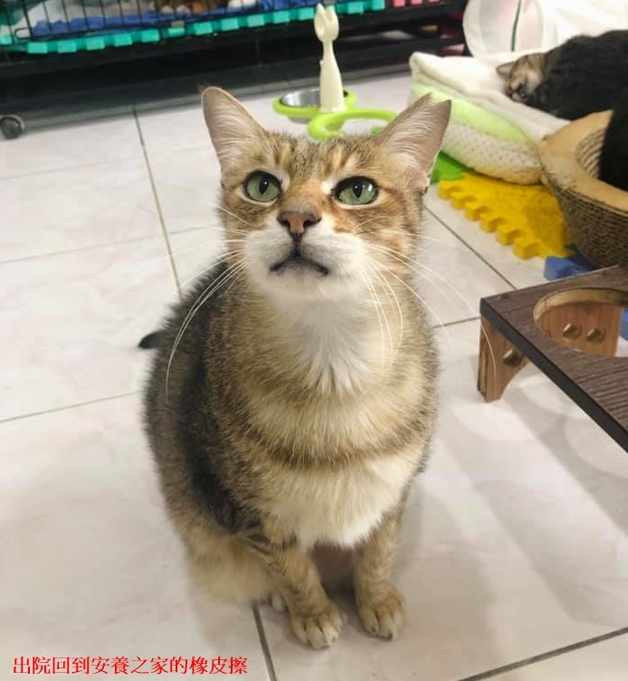在安養之家的好環境及照護人員的細心呵護下,橡皮擦的健康慢慢的好轉也漸漸長大,他的個性非常親人,每晚工作人員去發零食的時候,他總是圍繞在腳邊搶食,搶著吃第一碗,模樣相當可愛。