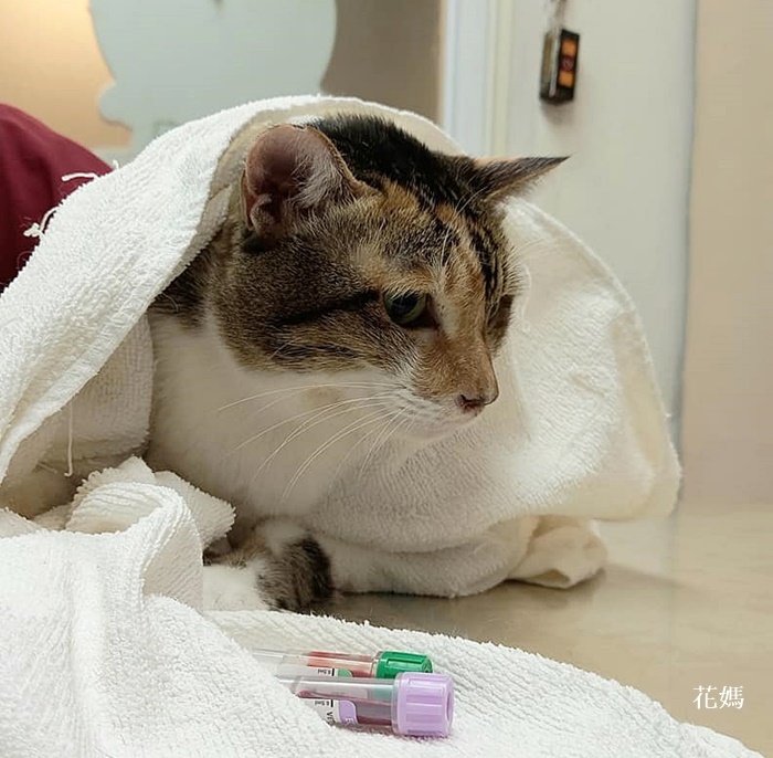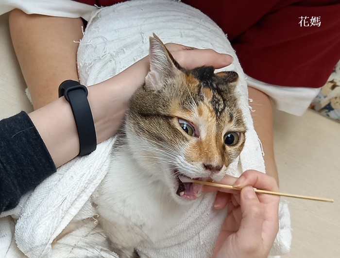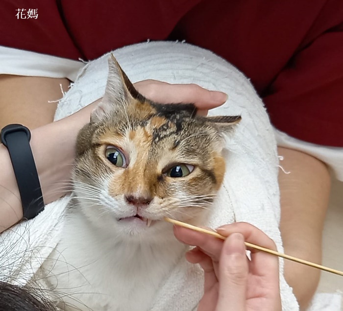 治療至今,花媽的肝指數已經穩定,而口炎及血糖問題在吃類固醇及乳鉻後也得到良好的控制,只是花媽因被救援前的健康實在太糟,在天氣變化時會流鼻水較嚴重,就需要另外吃抗組織胺及抗生素、氣霧治療。