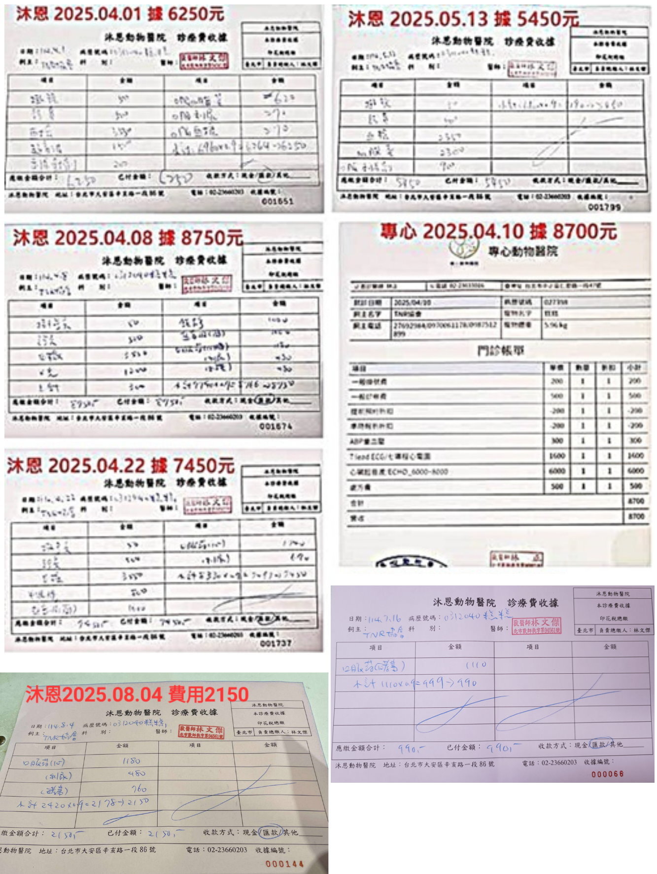 至目前糕糕的食慾精神都還好,他的年紀大了又個性很緊張,所以對於做侵入性的檢查治療都需要很謹慎評估,本筆醫助是2025年6月10日至2025年8月4日間於沐恩醫院的費用,包含血檢、超音波及用藥。