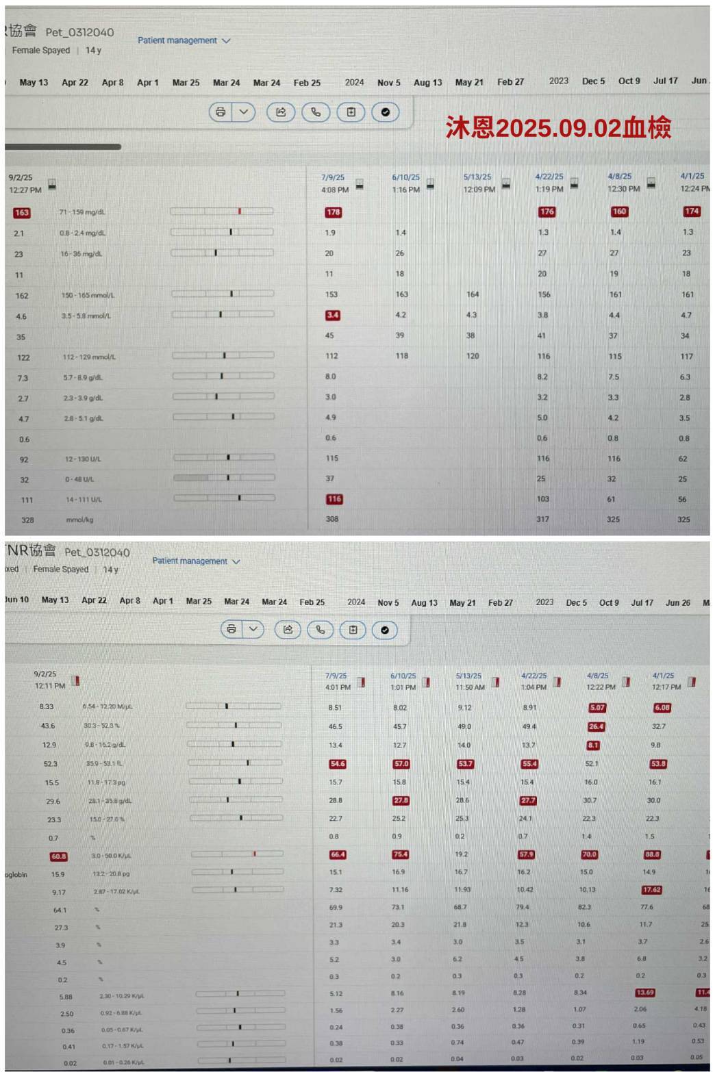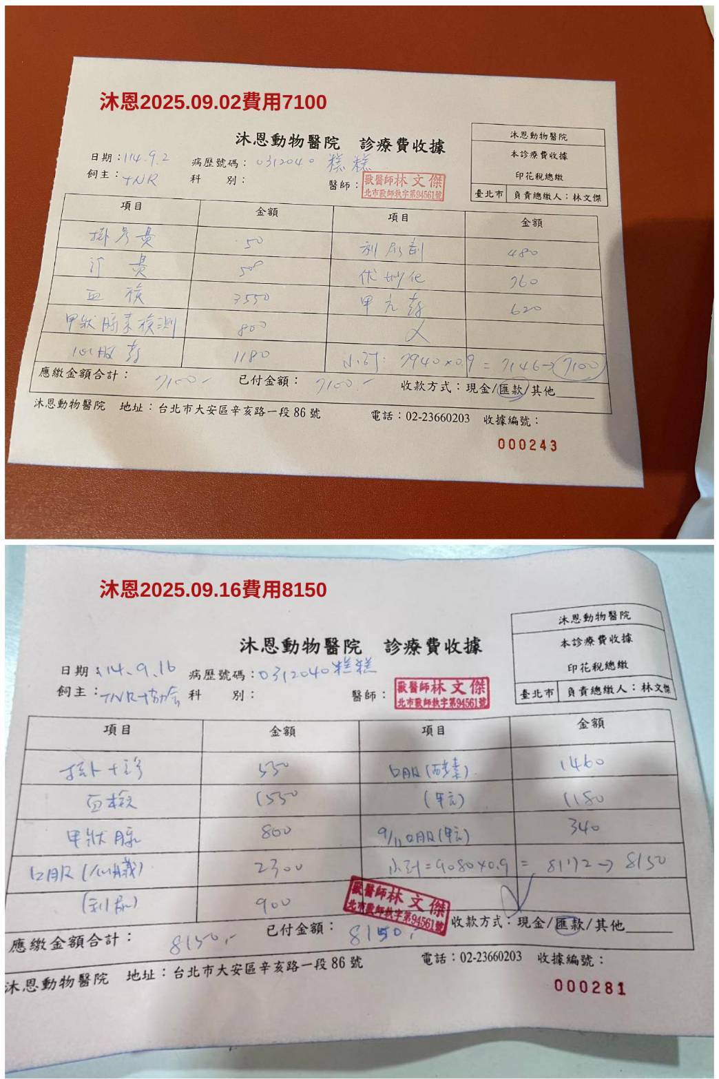至目前糕糕的食慾精神都還好,他的年紀大了又個性很緊張,所以對於做侵入性的檢查治療都需要很謹慎評估,本筆醫助是2025年9月2日至2025年9月16日間於沐恩醫院的費用,包含血檢、超音波及用藥。