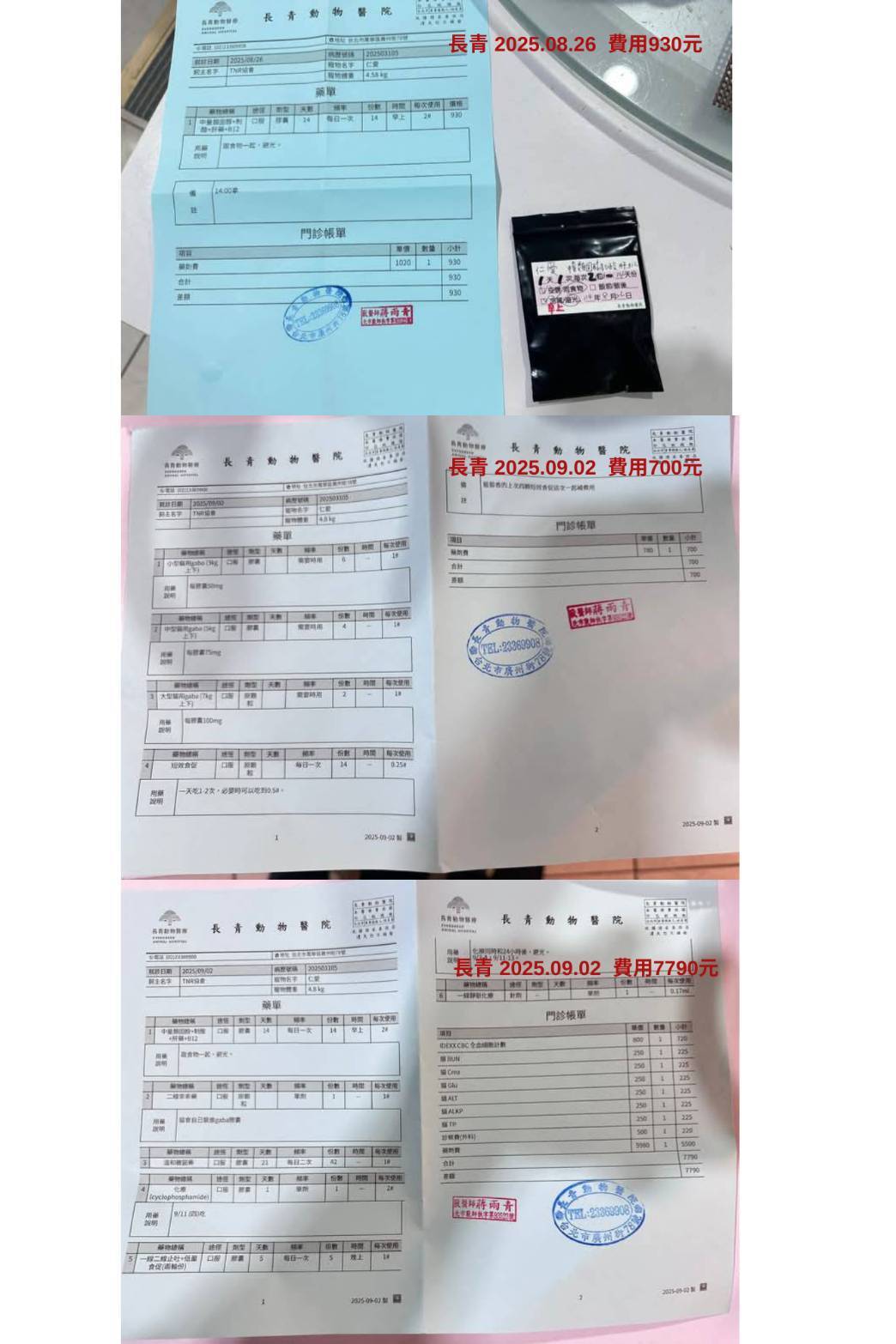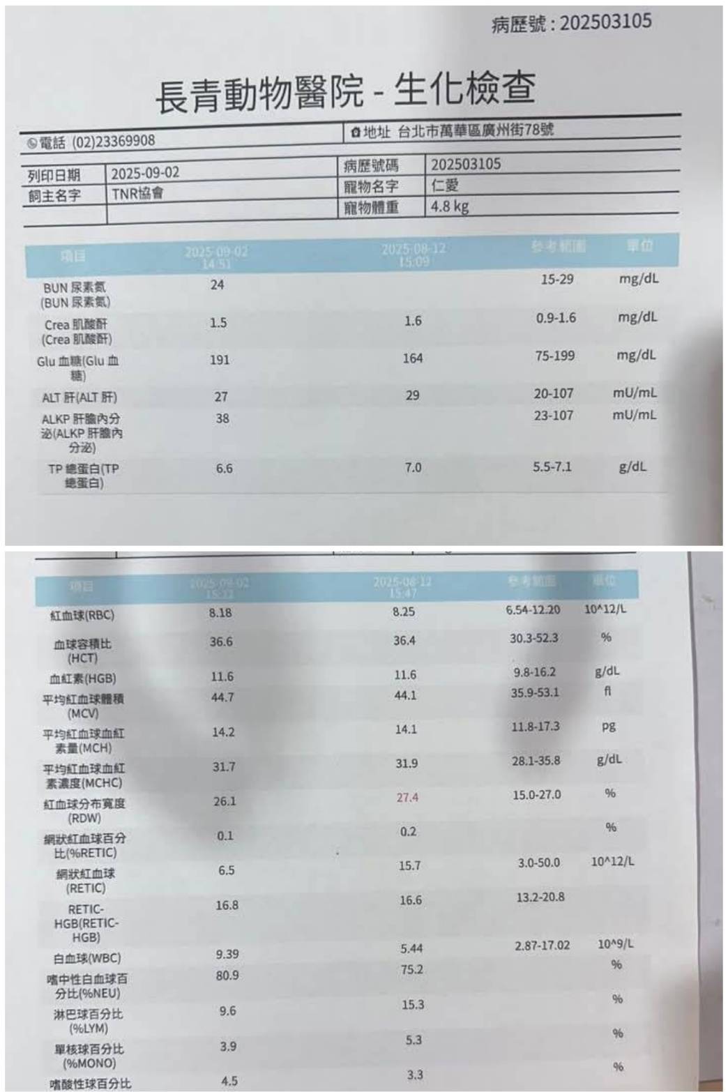 又於2025年9月2日進行回診與進行第八次化療針,此次精神較上次好上許多,肚子上的皮膚黴菌感染有變嚴重,須注意每日更換仁愛所躺的睡窩。因進行化療免疫力下降可能會讓黴菌變嚴重,但目前肝腎指數正常可持續吃黴菌藥治療。