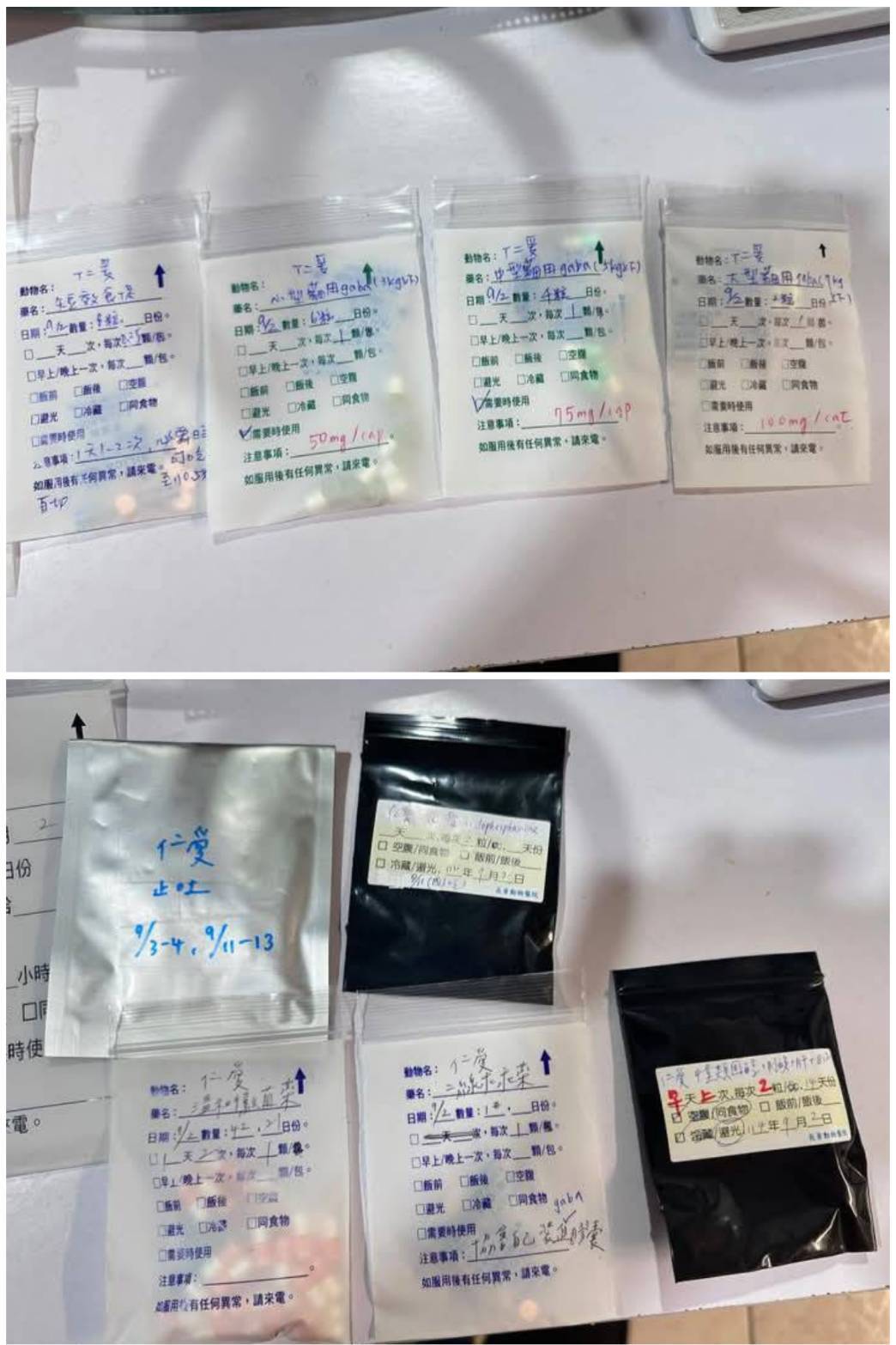長青醫院的腫瘤科醫師為仁愛擬定的化療療程是打針及口服輪流進行,初期要每週回診血檢、確定沒有影響到骨髓後再持續治療,除了化療藥,也要吃肝臟保養、止吐及食慾促進等用藥,是為了盡量減少化療藥的副作用及維持仁愛的健康,除了在2025年3月17日第一次吃化療藥的隔天仁愛有拉肚子、精神稍差,之後的每週治療後都沒有再出現明顯的副作用,平均每週的回診血檢結果都維持在正常值內,化療療程計畫是採取一週口服、一週打小針,無異常反應再延長時間而,總共是要打到9輪,。