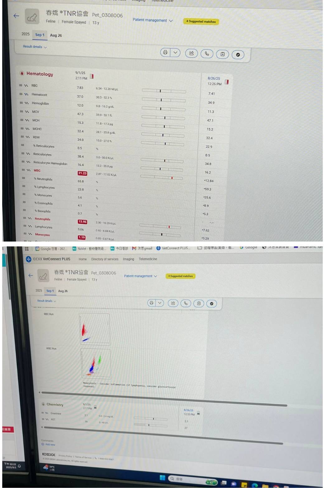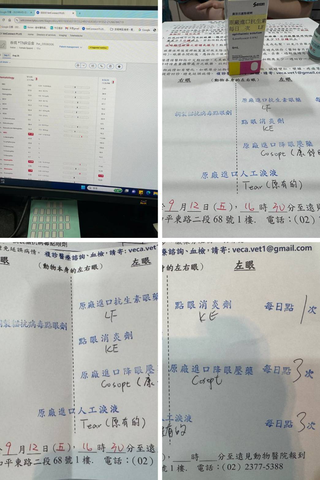 近期照護人員於早上發現春嬌左眼紅腫,就醫檢查後發現左眼潰瘍,懷疑是皰疹病毒復發,加開抗病毒眼藥。於2025年9月1日沐恩看診,因口腔問題可能導致白血球升高