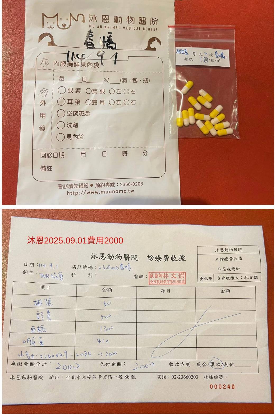 本筆醫助是於2025年9月1日於沐恩醫院及2025年9月6至9月12日於遠見醫院的費用,包含檢驗及用藥。