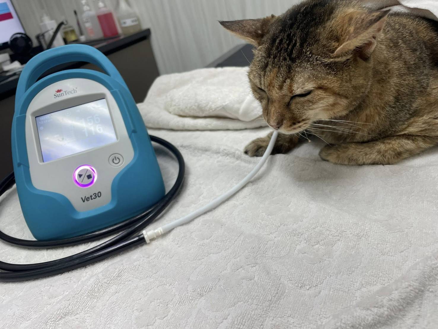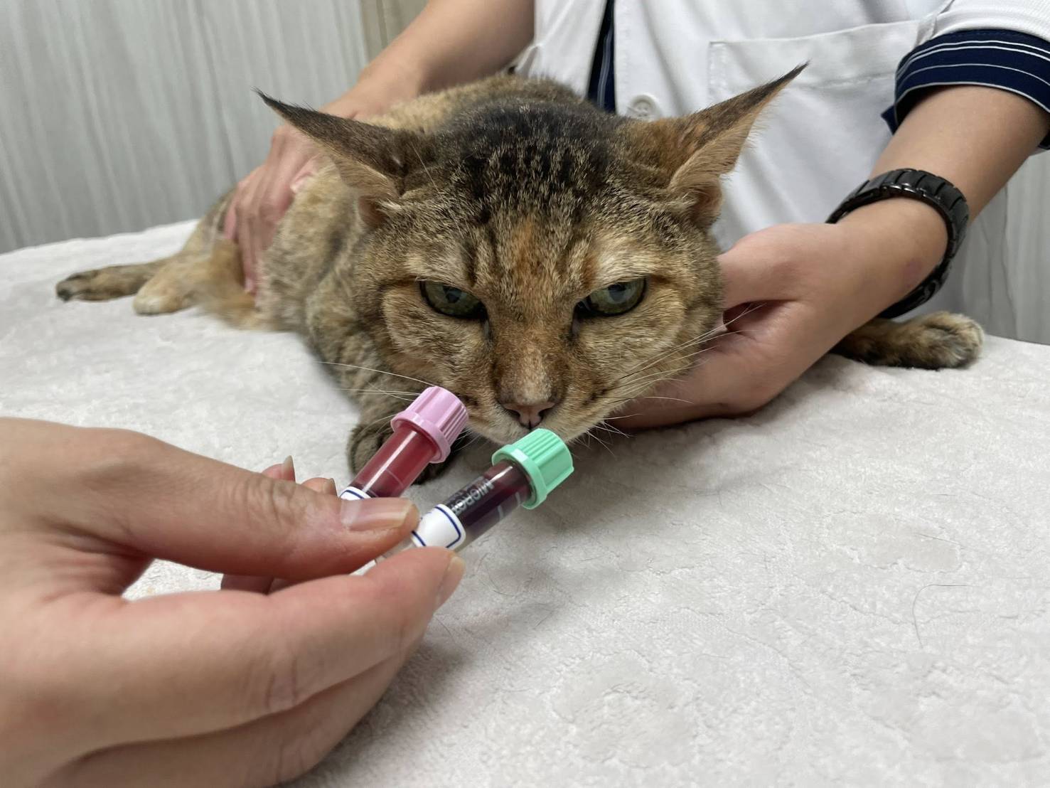 在2024年1月間阿咪因體型明顯變瘦,於2024年1月5日至沐恩醫院檢查,血檢結果腎指數及肝指數都高、有些脫水,口腔檢查發現左上犬齒牙齦腫起一包並有一個小傷口,X光檢查胸腔腹腔沒有明顯異常,整體檢查結果,主要是腎衰及牙周問題,只是在脫水及腎臟問題未處理好之前,不宜接受麻醉手術,所以先打皮下輸液、吃食促,二週後回診紅血球指數下降及磷上升指數,增加打造血針及吃降磷藥,治療至內科狀況較為穩定後,於2024年3月19日進行牙周手術,因腎指數仍是較高、麻醉手術不宜過長時間,所以手術只拔除狀況較差的四顆牙齒,完成牙周手術後仍持續回診治療肝腎指數問題,為了幫助阿咪的健康能更穩定,也開始做胜肽治療。