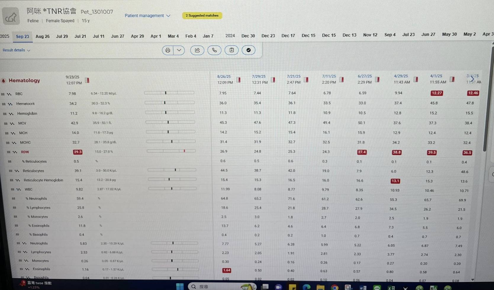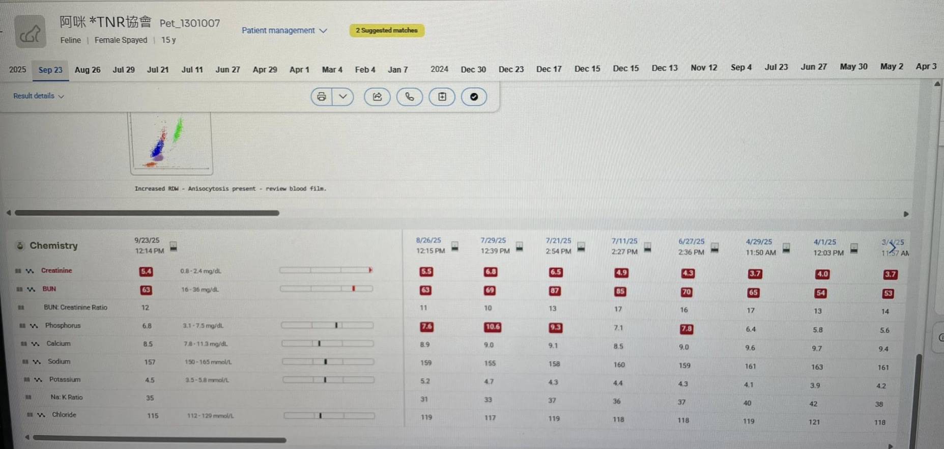 2025年7月29日因磷指數持續上升降磷藥劑量加倍,改為早晚各2顆。因阿咪指數上升緩慢無大礙其他藥先照舊,加磷看能不能降磷指數,需注意排尿與精神狀況。若皮下未吸收、精神食慾變差,需提早回報看是否提早回診。2025年8月26日回診,血檢結果良好,持續保持用藥。