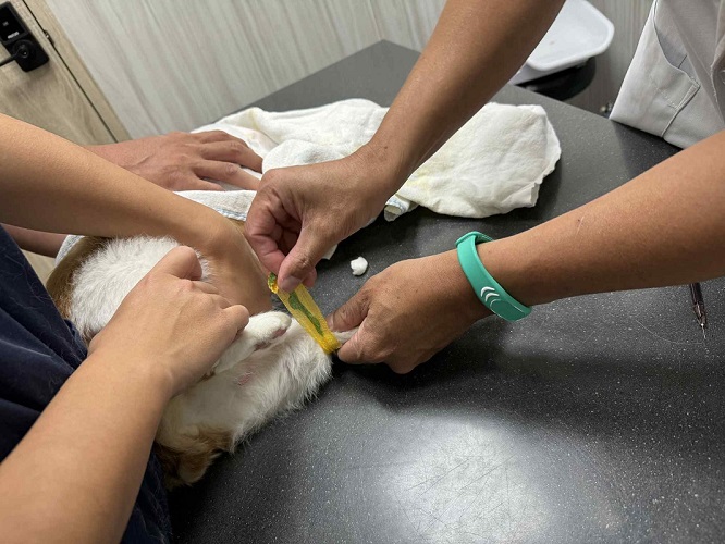 三天後福橘出現鼻血、嘴巴下方口水污漬,因此於6月29日至沐恩醫院檢查,但福橘個性是非常緊張,極力掙扎抗拒,無奈只好給予輕微鎮定後再進行,檢查結口腔內有大片潰爛紅腫,血檢結果紅血球偏低、發炎指數相當高,這是因血巴東及口炎的影響,研判是鼻腔感染導致黏膜受損所以流鼻血,醫師開消炎消腫藥還有抗生素,之後回診打長效抗生素針,另外送驗抗核抗體檢驗查看自體免疫情形、以做為日後醫療的依據,至7月間回診仍有流鼻血且口炎也還嚴重,抗核抗體檢驗報告結果的數值很高,表示有自體免疫問題,開始吃高劑量類固醇控制口炎,但擔心血糖升高所以也要吃乳鉻,福橘戒心仍很重,稍微靠近開始生氣要打人,只能將藥放在食物裡,但若飯沒吃完,用藥就吃不足量、無法有效治療口炎,因此經醫師評估,於8月19日進行牙周手術,將剩餘的9顆牙齒全數拔除。