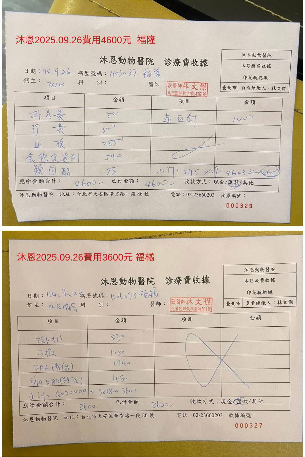 此次於2025年9月5日回診,今進行胜肽治療,然因腎指數飆高無法施打鎮靜劑,故此次沒有進行X光拍攝。近期再於9月26日回診,腎指數還是有點高,但因體重有變重,還在可接受範圍。但紅血球數偏低,需打造血針並持續觀察。本筆醫助是福隆於2025年9月5日至2025年9月26日間於沐恩醫院的醫療費用,包含血檢及用藥。
