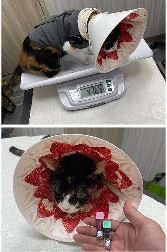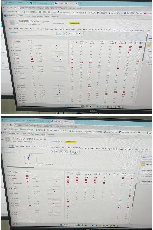 2025年3月25日花嬸突然沒有像往常一樣,拿掉頭套後就想舔,精神不好,頭套裡有嘔吐物,還有蹲便盆但沒有尿便,詢問沐恩後臨時回診,體溫稍微高一點,血檢結果沒有胰臟炎,但白血球升高了,X光檢查胸腹腔沒有發現異常,抽尿檢驗沒有發現細菌的感染情形,就先以腸胃炎治療,打皮下輸液及制酸止吐針劑,看診回到安養之家後,花嬸可能打過針有較為舒服些,有立刻吃飯,也沒有再嘔吐或異常的蹲砂盆行為,2025年4月2日回診追蹤,白血球已經降到正常值了,體重有維持,表示腸胃炎的問題有得到改善,只是血糖升高較多,需要多留意有無異常的多渴多尿。
