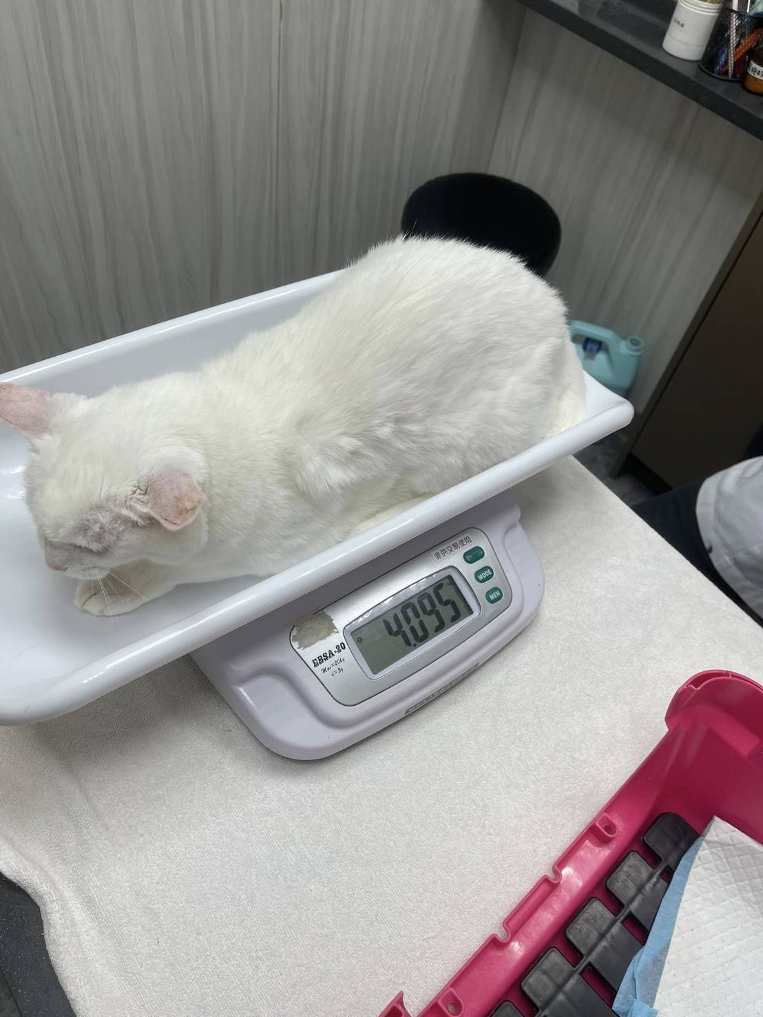 小白是很漂亮的純白貓咪美女,目前食慾精神都很穩定,因關節退化問題,走路看起來是踩著小碎步,相當可愛,照護員每天持續讓她吃關節保養品控制關節退化,也每週測量體重紀錄,只是畢竟小白年紀已大,腎臟功能的衰退是不可逆,只希望經由用藥能延緩病情及維持生活品質,本筆醫助是自2025年9月24日間於沐恩醫院的費用,包含回診血檢、測量血壓及用藥等等。