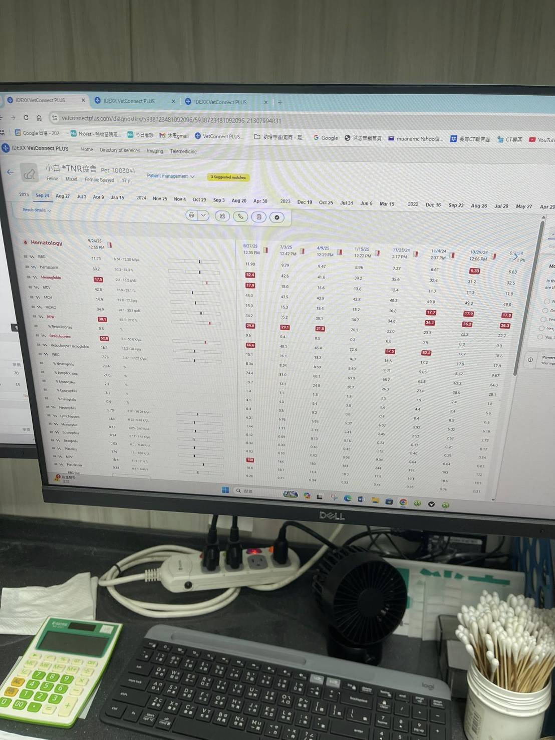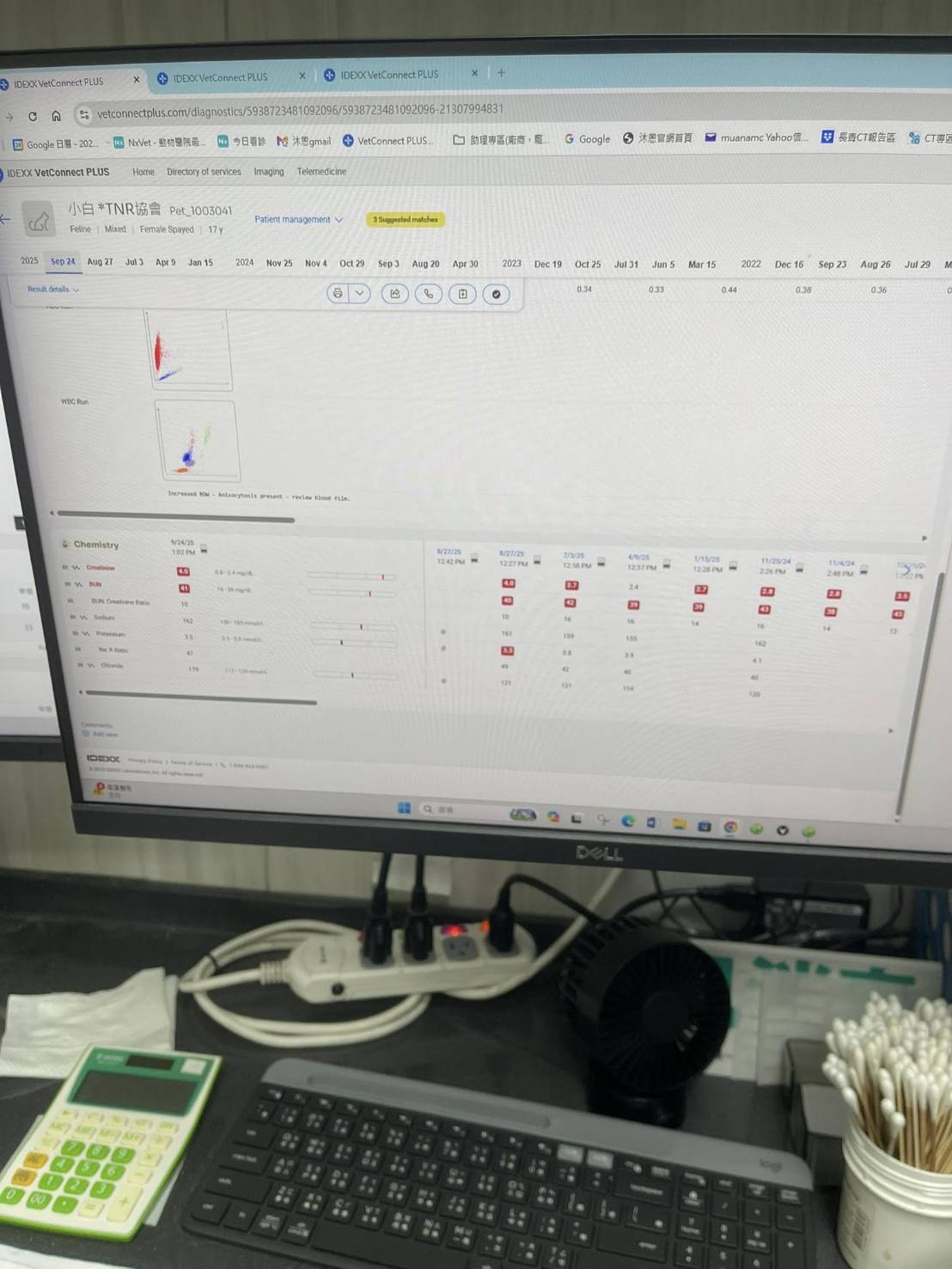 2024年8月回診,腎指數又開始升高,開始打皮下輸液,但兩個月後回診的腎指數還是繼續上升,紅血球指數也下降、血壓稍高,要打造血針與吃血擴藥,為讓小白的健康更穩定,開始給予胜肽治療,至2025年1月回診,血壓已經恢復正常數值、體重回升,腎指數仍高於標準但沒有再上升、紅血球指數回升,口腔狀況良好,整體檢查結果有進步,可以延長回診時間,期間回報及取藥即可。