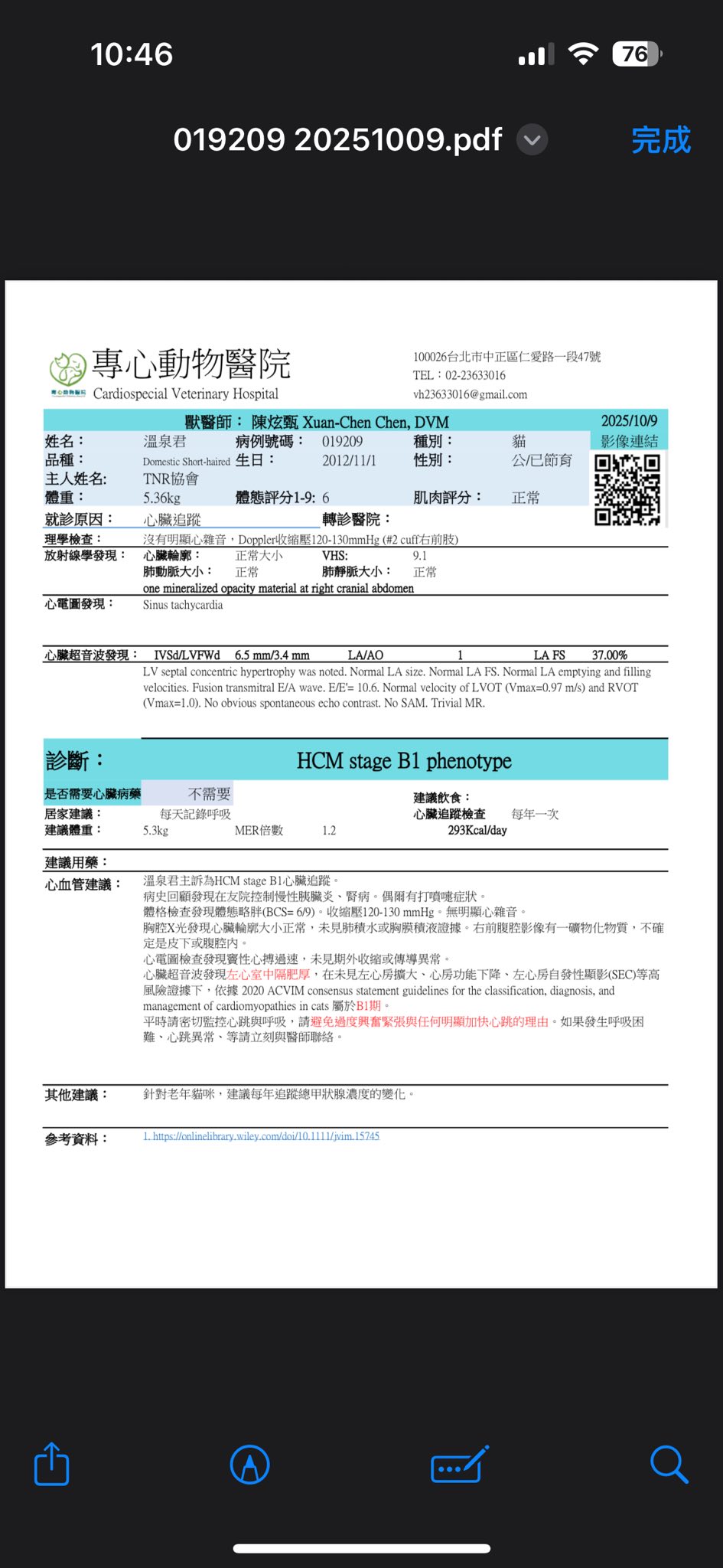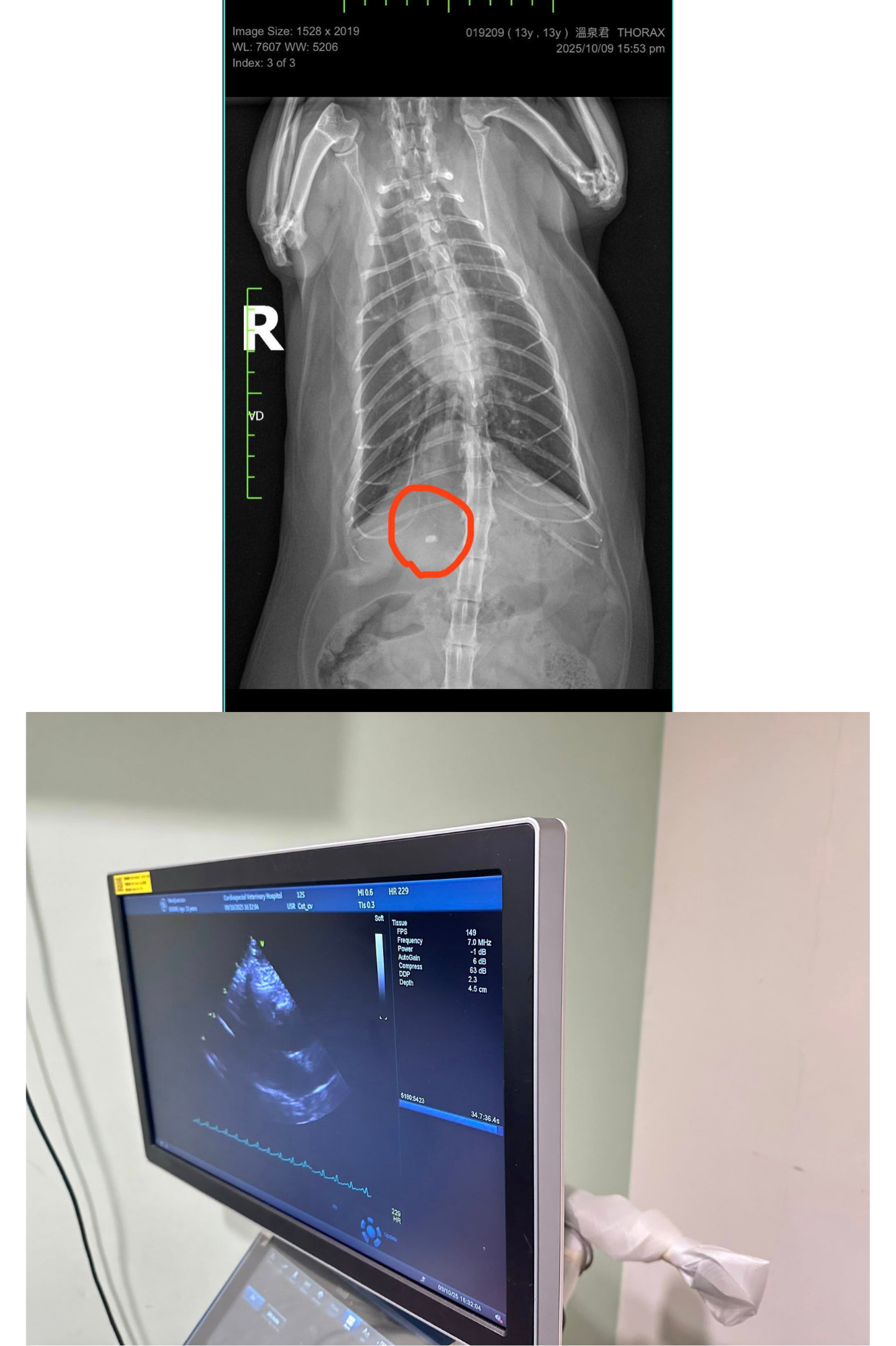 右前腹腔影像有一礦物化物質,疑似膽結石,不確定是皮下或腹腔內,但需詳細確認的話,需用超音波檢測。總體來說,溫泉君心臟維持的不錯,無惡化。平時請密切監控心跳與呼吸,請避免過度興奮緊張與任何明顯加快心跳的理由。