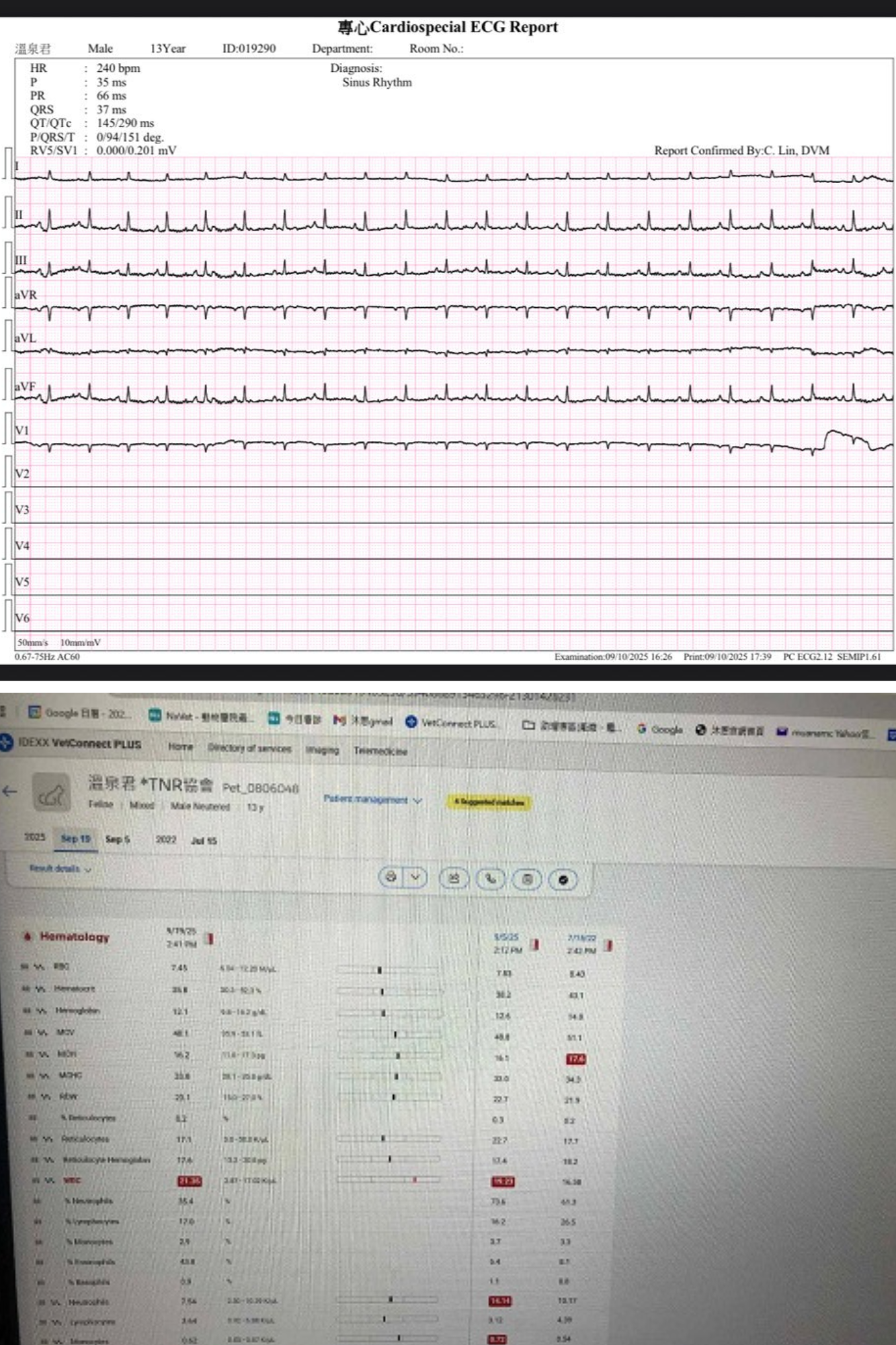 近期於2025年5月9日回診,心跳血壓檢查,心跳稍快、血壓稍高,外觀沒有明顯呼吸道症狀,血檢結果,紅白血球、肝腎、離子指數、白蛋白、免疫球蛋白都在正常值,但是嗜酸性球指數升高於正常值,因此項指數與過敏及寄生蟲有關,醫師認為雖然溫泉君生活的環境應無寄生蟲的疑慮,但為排除原因,建議要再點全能貓,另外因照護員有看到溫泉君過跳躍失敗,醫師再檢查後腳,檢查結果,左後髖關節有些退化及左腳踝韌帶較鬆、關節微腫,因並不是持續的經常跳躍失敗或走路有異常,就還不需要吃止痛藥,如果異常情況再度發生、頻繁,就再約診拍X光,至於心臟部份,醫師師表示,每次回診都會測量血壓及心跳都沒有異常變化,且溫泉君也沒有長期打皮下輸液的需求,所以暫時不需特別做心臟檢查,可在三至六個月後下次回診時,再看檢查結果決定是否須再由長青的心臟科醫師做相關檢查,本次查結果穩定,用藥照舊,無異常就回報拿28天份藥。