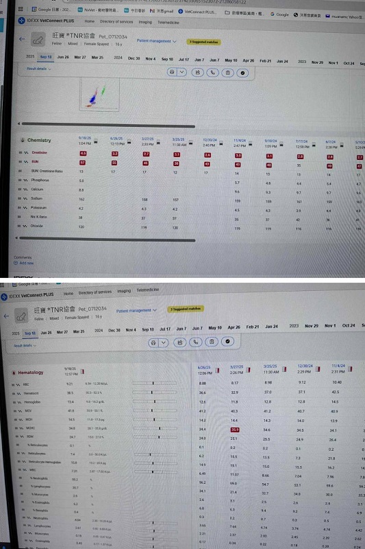 2025年3月25日的回診,腎指數一項上升、一項下降,而體重減輕較多,因平時沒有出現特別異常,用藥就先維持並留意體重是否持續下降,原本可三個月再回診,但看診後隔天晚上旺寶突然連續嘔吐還拉肚子,在詢問過醫師後當晚先幫旺寶打皮下輸液,並於2025年3月27日回診檢查,回診前的早上旺寶食慾有恢復也沒有再吐拉,胰臟炎檢查是陰性、腎指數仍高但沒有異常的升高、白血球上升但仍在正常值內、沒有發燒,依據血檢及臨床檢查,先以腸胃炎處理,再打幾天皮下輸液及制酸止吐針劑。