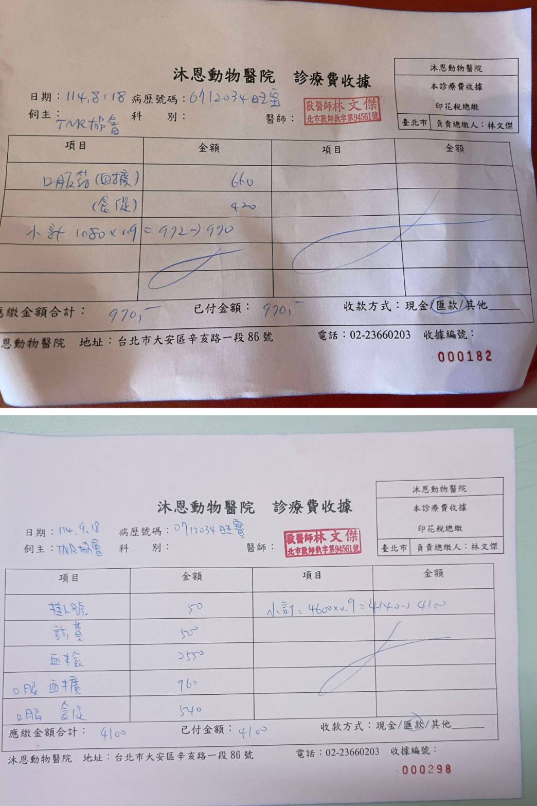 2025年9月18回診, 腎指數上升許多需增加皮下輸液,為避免體重減輕,食促也改為2天一次。線外耳廓有耵聹腺瘤須保持日常耳朵清潔。本筆醫助是2025年8月18日至2025年9月18日間於沐恩醫院看診血檢及取藥的費用。
