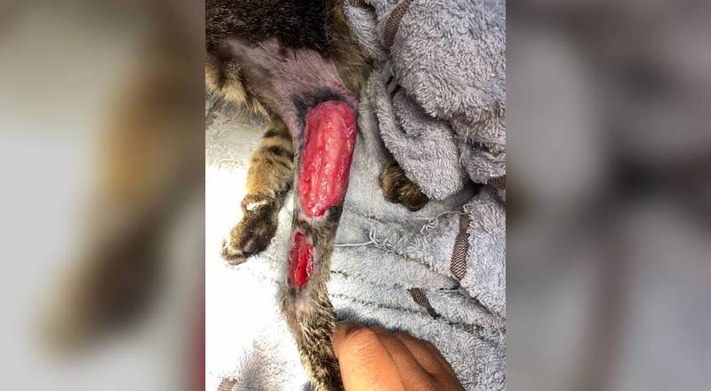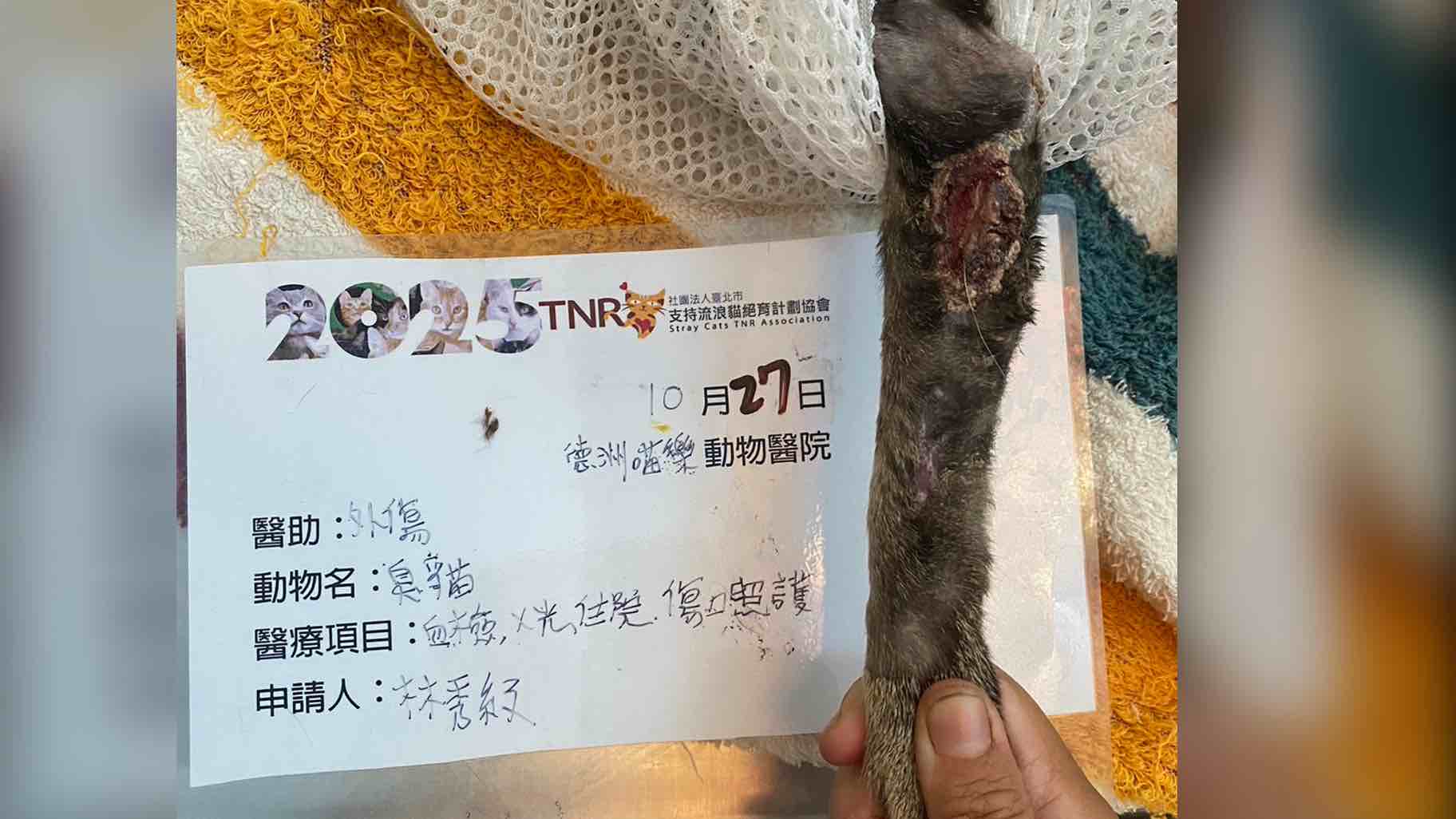 我平時在鳳山特定區域餵養浪貓和幫助浪貓抓紮已近十年,前陣子才剛自費救助脫肛嚴重的花貓,心有餘而力不足這隻手受傷的小臭貓;她是在我家人住處附近突然出現的貓,平時沒看過這隻小朋友,初次見面就看到手傷得如此嚴重,年齡又小約莫五個月,很心疼她所以稱她為小臭貓。