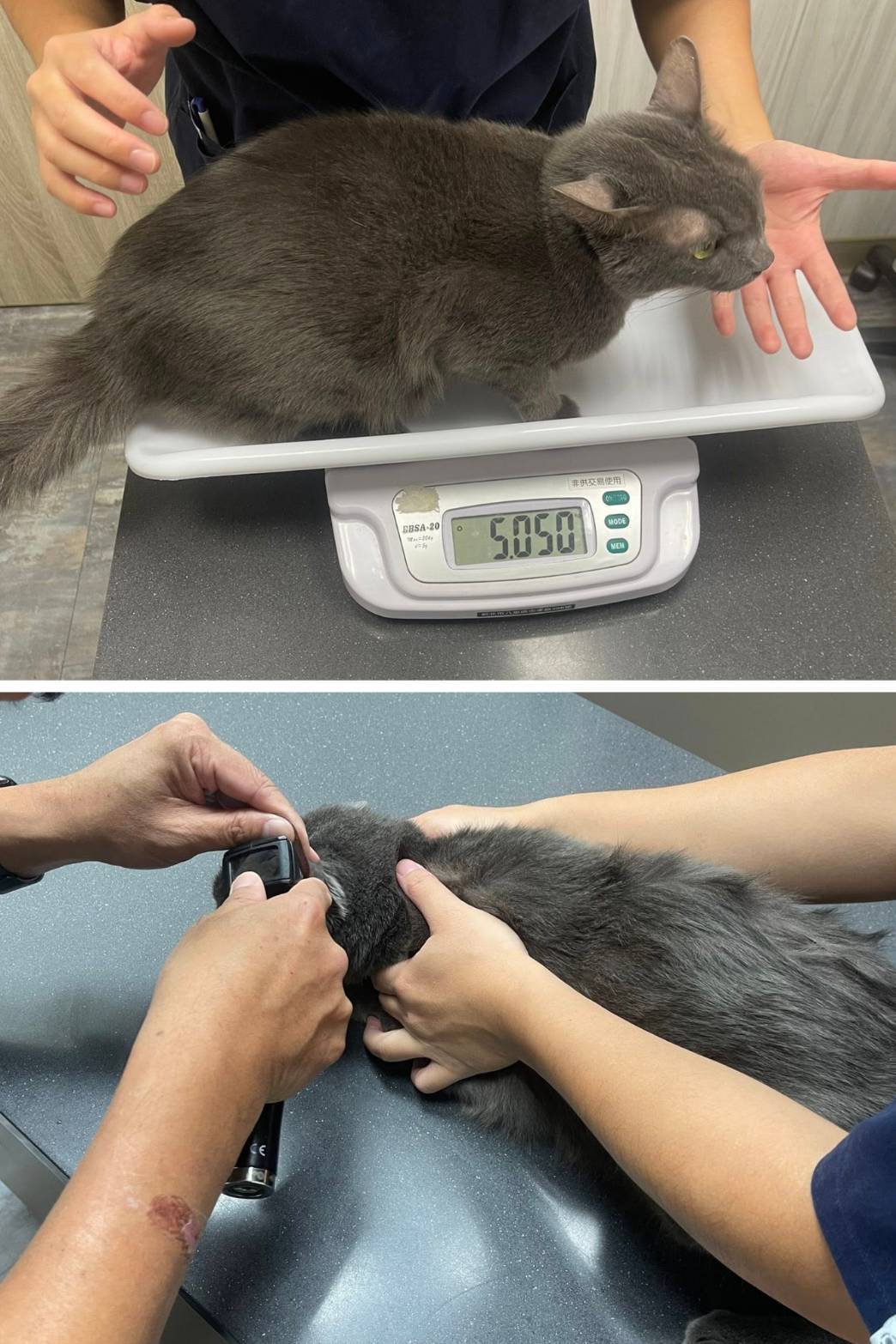 2024年2月15日連續嘔吐,先向醫院拿回制酸止吐針及打皮下輸液,但2月16日早上精神仍不好,因此臨時回診檢查,肛門處的毛有些沾到髒髒的,應是也有拉肚子。血檢結果,胰臟炎陰性,白血球升高於正常值,以檢查結果研判是腸胃炎,開抗生素針劑,為了讓消化道休息,原本的醫院用藥及肝藥都先停,同時因有噴濃鼻涕,採樣送細菌培養。