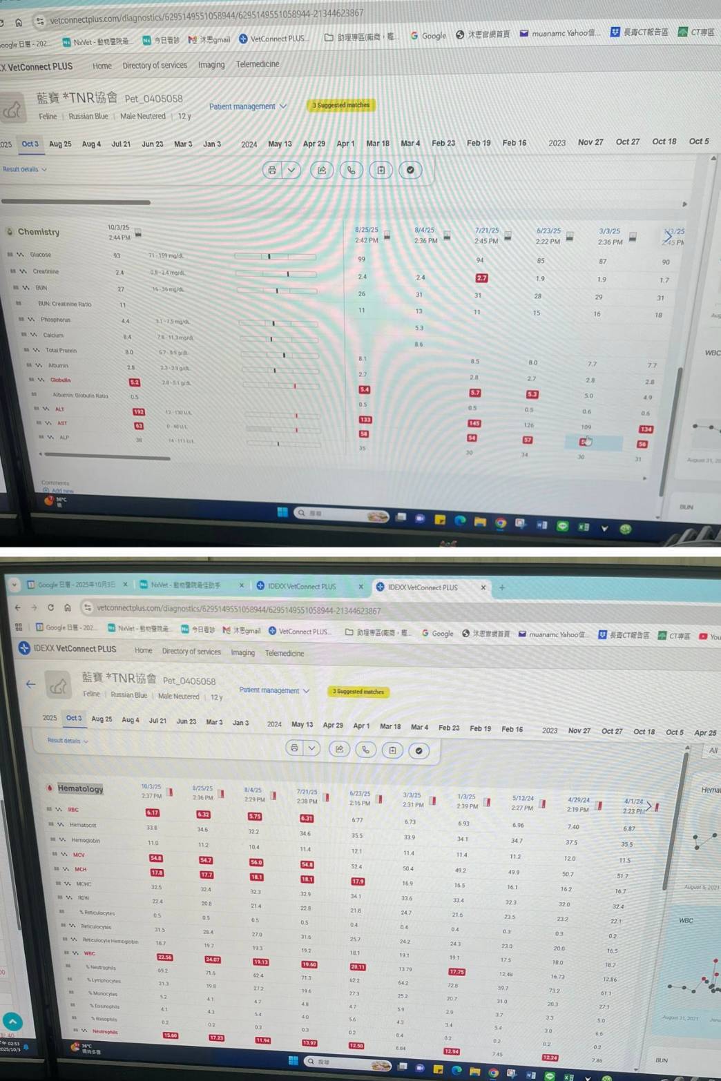 2023年10月18日,藍寶因頻吐水及拉肚子臨時約診沐恩,血檢結果,白血球升高到三萬二,X光檢查呼吸道有些膿、肺部影像有些花但與之前比較是差不多,研判是消化道嚴重發炎,住院治療打靜脈,並開始做氣霧,幸好隔日狀況有好轉沒有再吐了,食慾也有恢復一些,因此10月20日便辦理出院,出院後於10月27日再回診追蹤,白血球已經降到正常值,紅血球因先前發炎造成的損耗有下降,還需一段時間的恢復,肝指數雖有下降但仍偏高,再吃肝藥應會有幫助,整體結果是有進步了,2023年11月回診,外觀上有鼻水跟一點鼻塞,下降的紅血球指數有回升,肝指數有下降但還是偏高,發炎指數升高因是與鼻水有關。醫師說明,吃回肝藥之後,肝指數下降較不明顯,可能需要再一段時間觀察,走路觀察步態良好,沒有明顯跛足,整體檢查結果有進步、體重增加,可半年再回診,期間取藥即可。