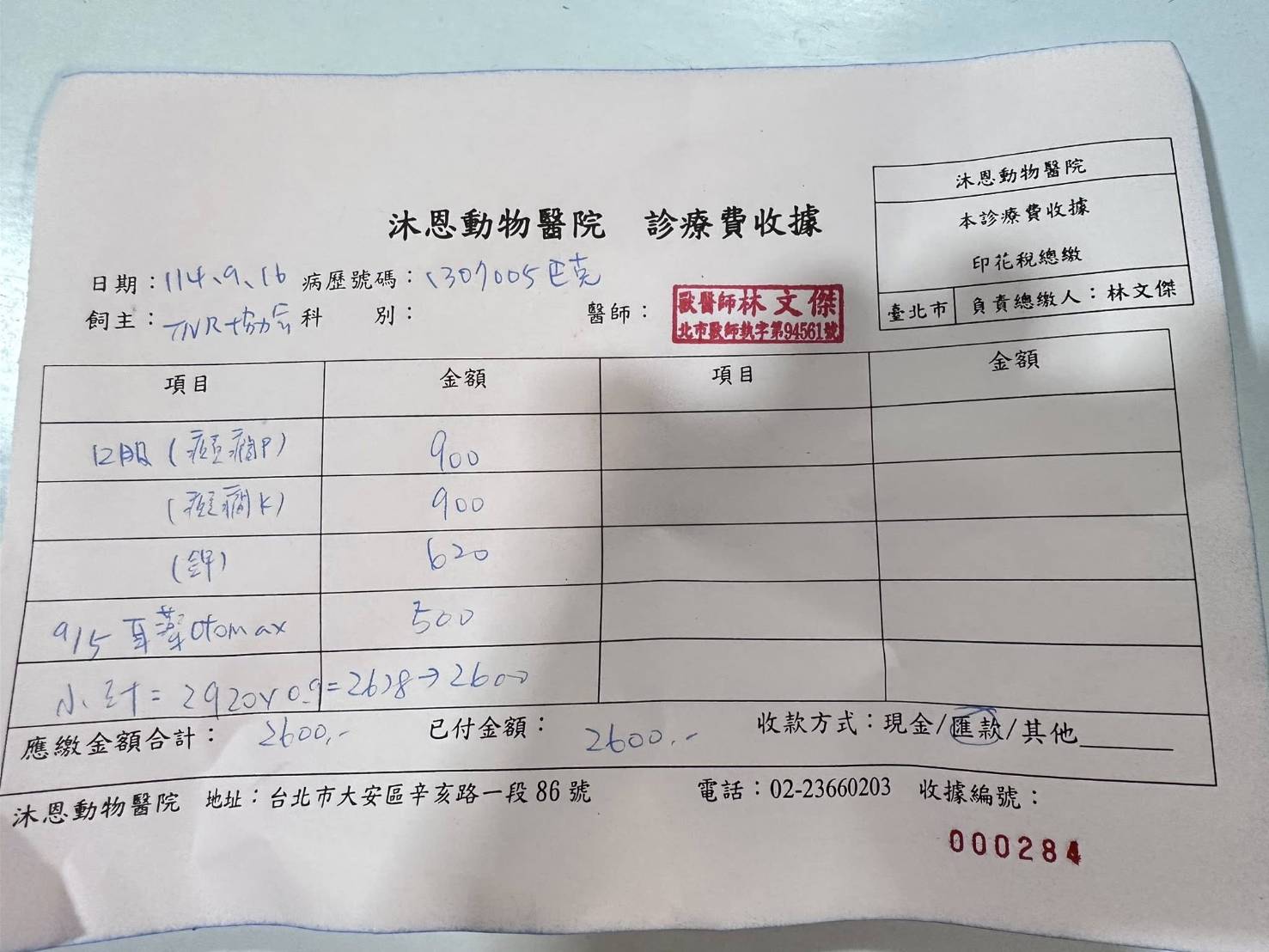 主題: 終身癲癇治療的巴克 申請者姓名: TNR協會 花色: 申請日期: 2025-10-23 12:46:38 申請者部落格: https://www.facebook.com/SupportTNR/ 申請者臉書網址: https://www.facebook.com/SupportTNR/ 所在縣市/合作醫院: 台北市/沐恩動物醫院 治療費用: 11400元 需求人數: 38人 已結案 (2025-12-11 16:30:24) 報名人員: Ayahsu x2(已付款)、22(已付款)、東原風眞(已付款)、無名氏(已付款)、小翔、黑貓(已付款)、張雅筑 x5(已付款)、JuJu x2(已付款)、May x7(已付款)、IAMROGER x7(已付款)、羅志傑 x10(已付款)、Kenji Lin(已付款)、 候補人員: 動物病情說明: <癲癇與黴菌追蹤的巴克>