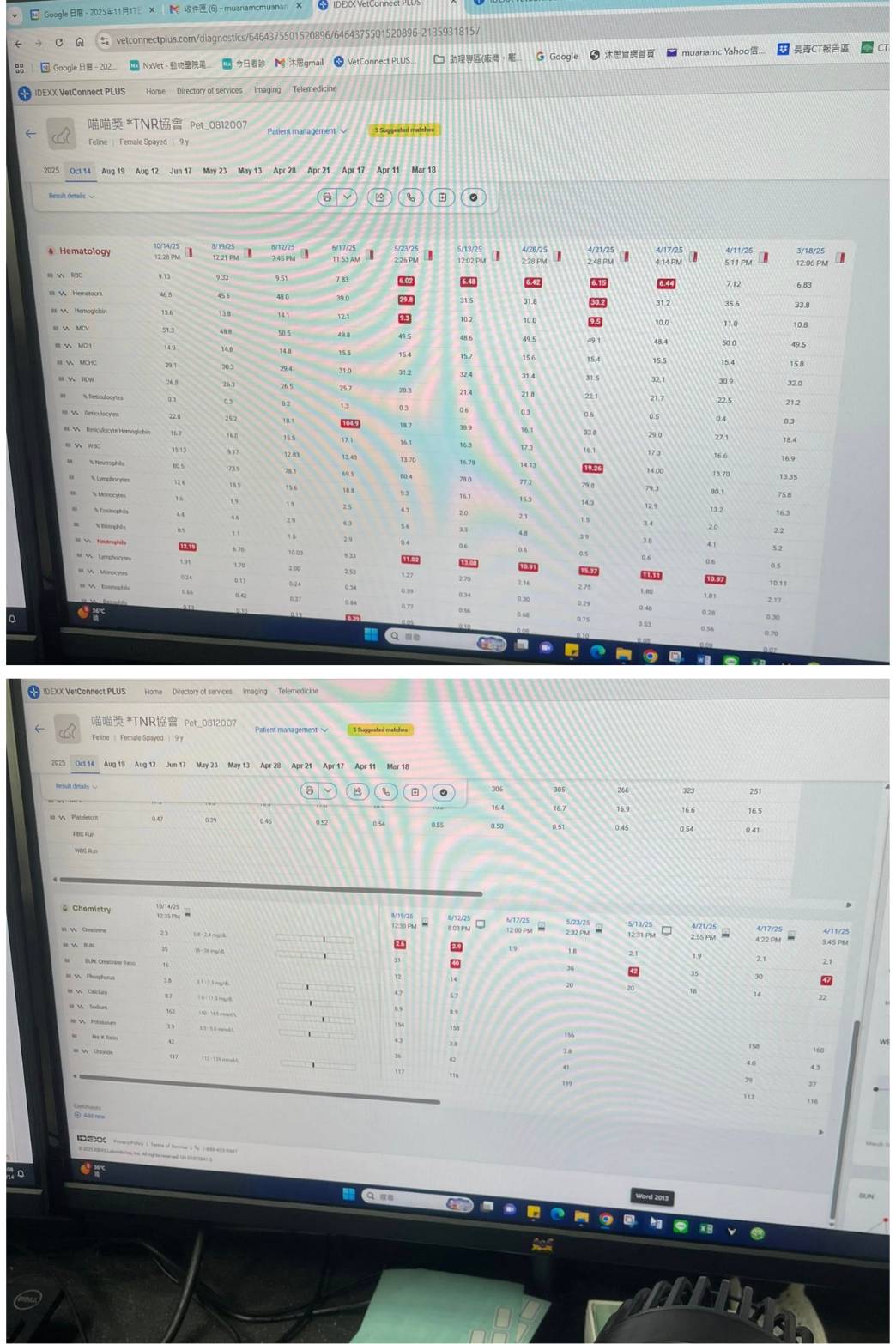 近期2025年8月12日因連續多日嘔吐及食慾不振安排回診,因擔心是胰臟炎安排超音波診斷,所幸未發現特殊狀況,唯有指數上升,研判是嘔吐造成,因此再加開胃乳,並持續觀察回報醫院。一個禮拜後8/19再度回診查看腎指數已有下降,需持續觀察食慾及嘔吐狀況。