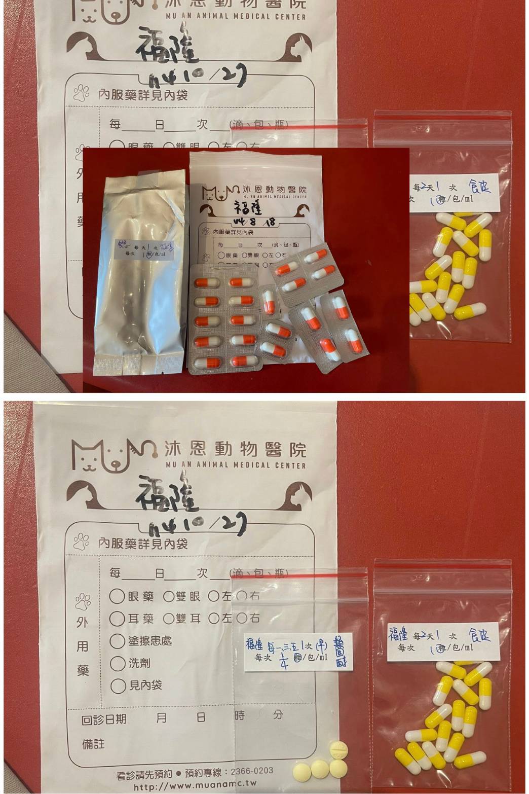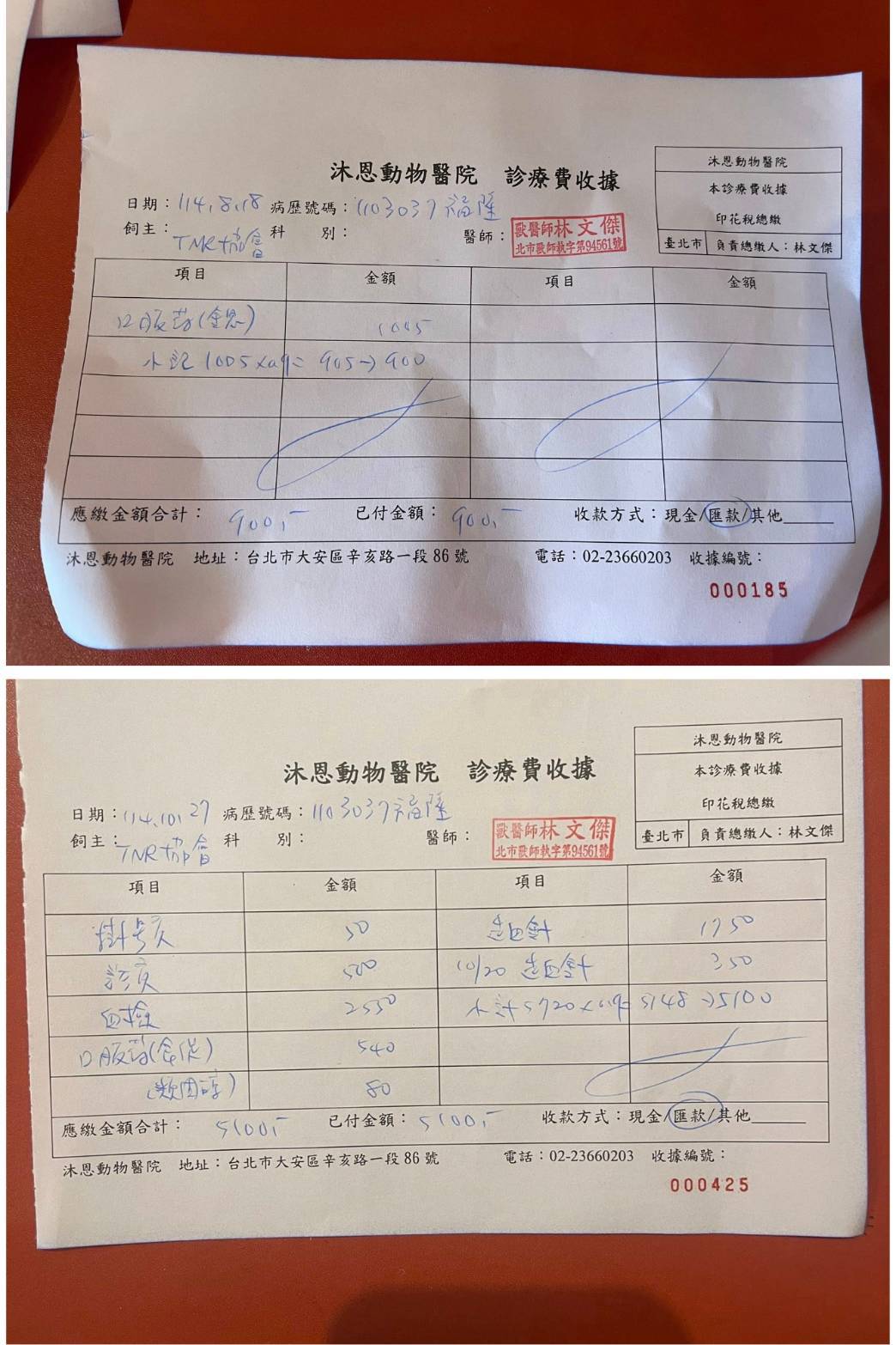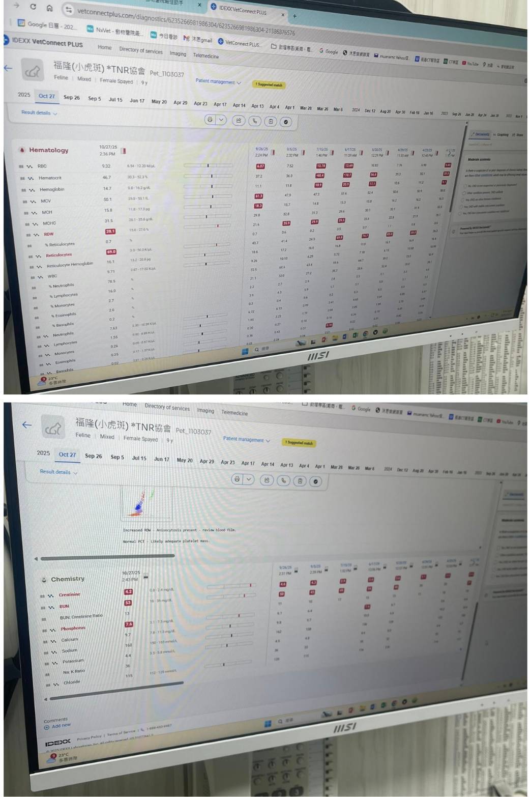 此次於2025年9月5日回診,今進行胜肽治療,然因腎指數飆高無法施打鎮靜劑,故此次沒有進行X光拍攝。近期再於9月26日回診,腎指數還是有點高,但因體重有變重,還在可接受範圍。但紅血球數偏低,需打造血針並持續觀察。後於2025年10月27日回診,腎指數依然超出指數,因此次調整用藥本筆醫助是福隆於2025年8月18日一筆於沐恩醫院取藥及2025年10月27日間於沐恩醫院的醫療費用,包含血檢及用藥。