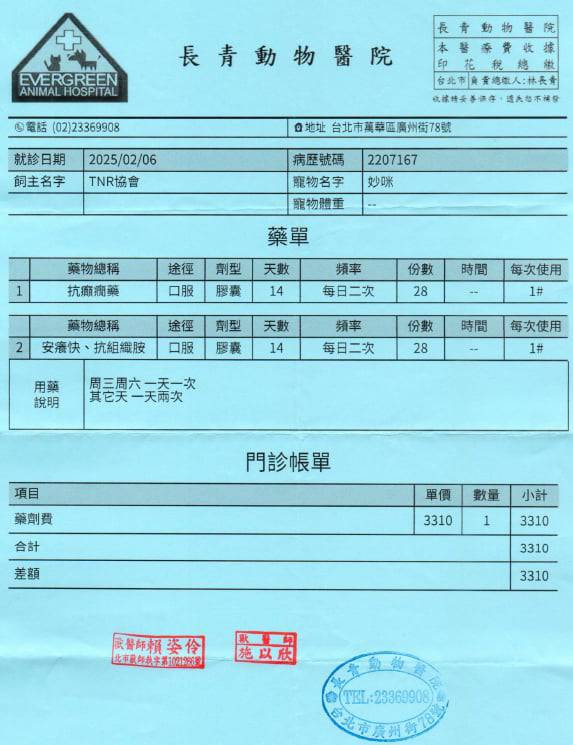 目前妙咪皮膚狀況維持得不錯,因擔心舔毛會誘發癲癇,所以仍須穿著防護衣及戴頭套,治療至今,癲癇發作次數及時間有明顯減少很多,但妙咪的癲癇仍可能會是需要終身吃藥;可憐的妙咪因被壞人傷害造成皮膚相當敏脆弱,並因此造成發作癲癇,還好有協會的救援與安置,讓妙咪能夠有機會接受最好的醫療與照護,妙咪的醫療用藥是終身需求,本筆醫助是自2025年2月06日至2025年10月28日間,至長青醫院取癲癇、止癢用藥的費用。