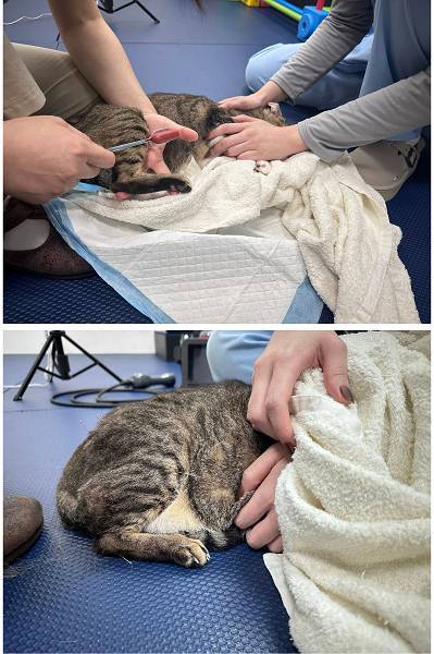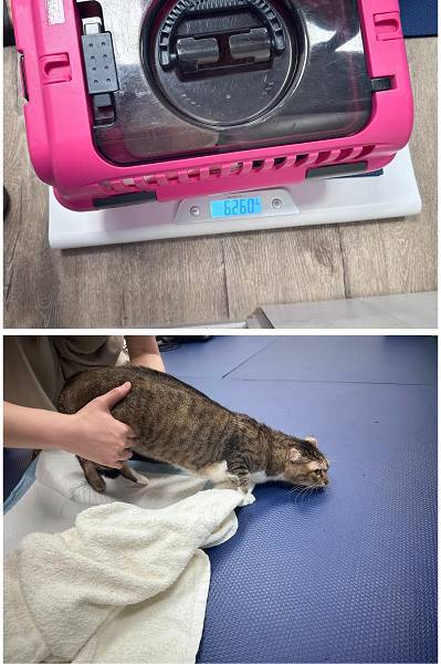 住院至2024年6月11日,羅賓已可自己吃足夠的飯,不須再裝餵食管,也能前手支撐自行移動爬至貓砂盆大小便,右後腳背處傷口已癒合,也不需再清潔換包紮,當天辦理出院接回安養之家照顧。