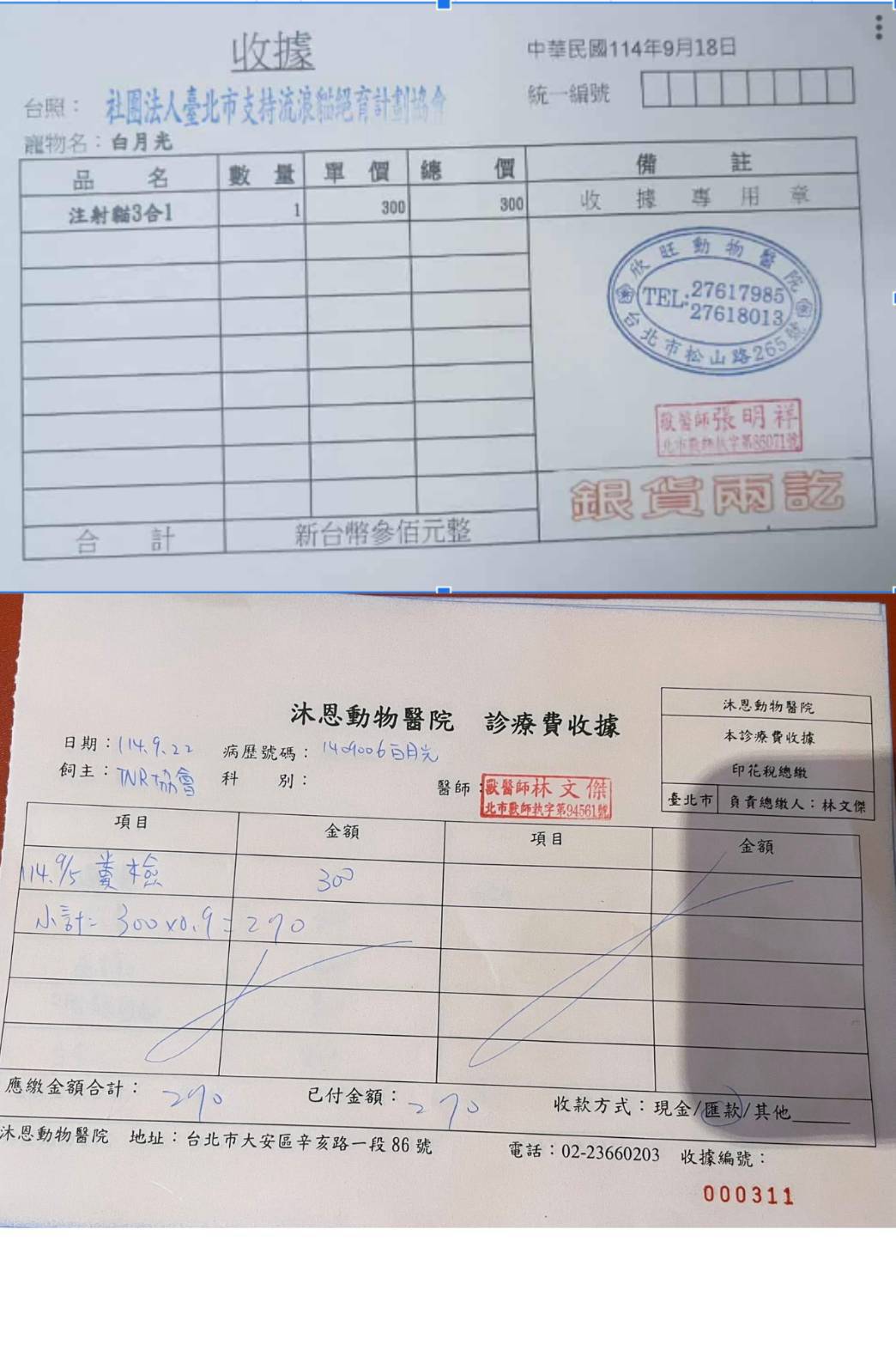 8月24日民眾再次通報,居民帶了隻母貓在自家院子生下的尚未斷奶小貓找她,媽媽應該是被抓去絕育。於是由協會義工帶回餵養,小貓應是8月初左右出生,目前正嘗試斷奶。,本筆醫助是2025年9月18日至2025年9月22日於欣旺醫院的費用,包含看診及預防針和糞便檢查。