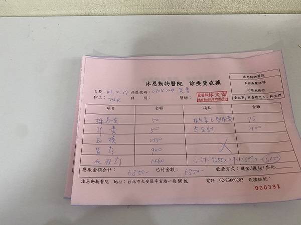 於2025年8月22日回診,腎指數跟肝指數稍降,但禁止吃點心,吃罐頭跟飼料就好。再於2025年10月17日回診,背部的黴菌感染持續擴大,醫生指示不用刷洗盡量讓皮膚保持乾燥,腎指數跟以往一樣腎指數跟以往一樣無太大起伏,食物盡量不要變,以腎處方為主。本筆醫助是2025年10月17日間於沐恩醫院的費用,包含血檢及用藥。