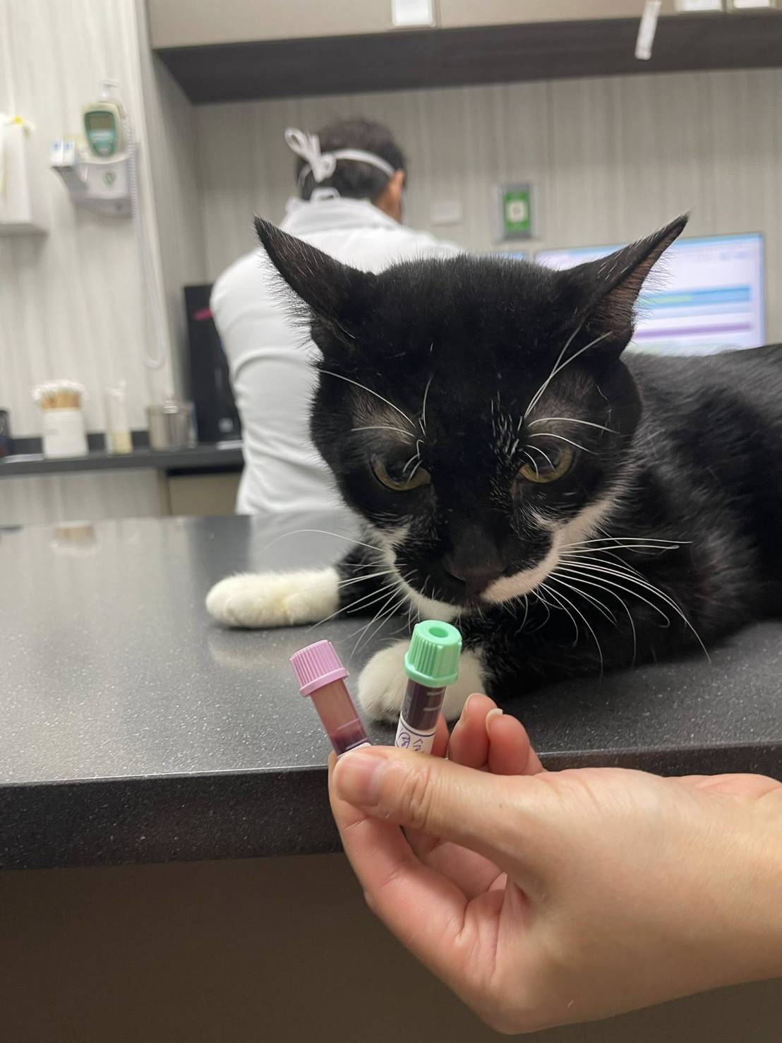 在2024年9月4日周全突然食慾精神變差、發燒,先至極光醫院看診,測量體溫有發燒、血檢及X光檢查,胰臟炎陽性、肝指數、黃疸、血糖都升高、腸道有很多便,有呼吸道症狀,先打皮下輸液,但醫師認為周全須住院,因此立即前往沐恩辦理住院,沐恩醫師研判是全身性感染、有敗血症風險,住院打靜脈抗生素及鎮定後浣腸將積便清空,但周全血糖一直居高不下,更換胰島素種類後才有逐漸降下來一些,雖然幾天後食欲精神都有恢復可以出院照護,但自此血糖一直都很高、每天早晚打胰島素及控制飲食,也須密集回診追蹤血糖。