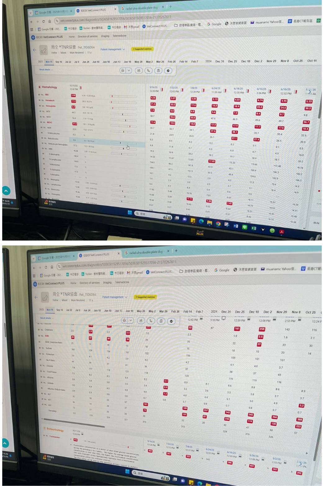 完成肥大細胞瘤的手術後,持續於沐恩醫院治療血糖,每隔一或二週就須回診留院幾小時測量血糖,原本因糖尿病被限制飲食的周全每餐都是立刻吃光光,但2025年2月7日突然異常的沒有立刻將飯吃光,精神也不大好,臨時至沐恩醫院檢查結果,果肝指數突然升高很多,超音波檢查肝臟未發現腫塊跡象,但腹腔影像偏亮疑似有發炎,先調整用藥並增加吃肝臟保健品,還好看診後食慾有恢復正常,醫師懷疑肝指數升高可能是與血糖高有關,腎指數也受到影響開始升高。