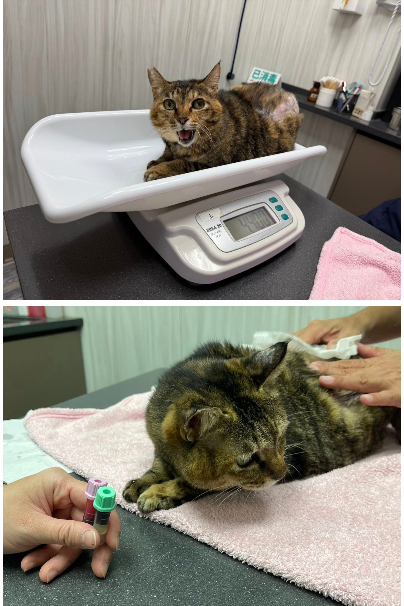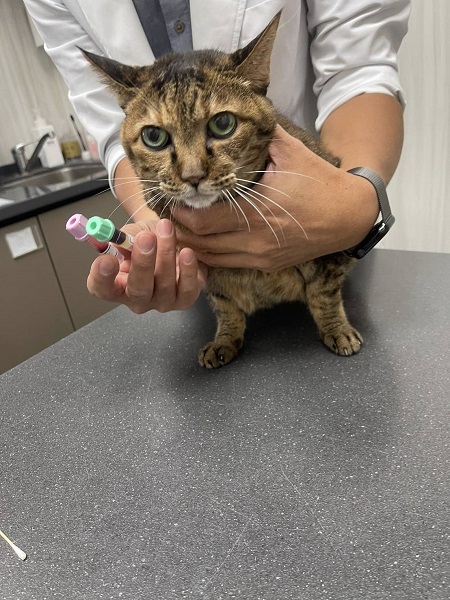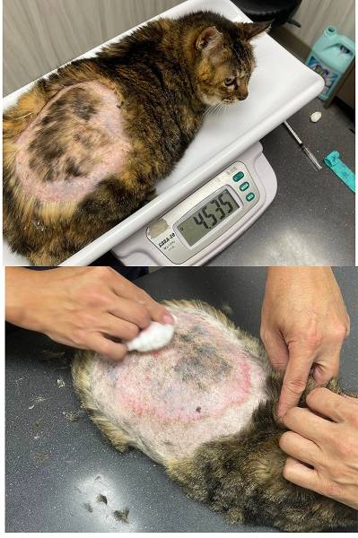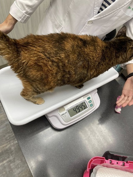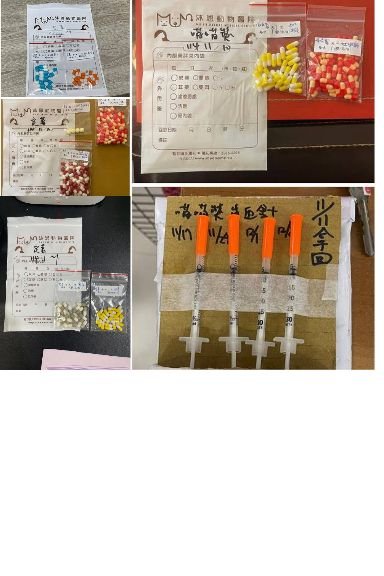 只是在7月11日喵喵醬又出現嘔吐,回報沐恩醫院後,因食慾仍還可以,所以先拿回止吐針劑,加入皮下輸液一起打,打完後幾日喵喵醬沒有再出現嘔吐,但食慾方面仍不是很穩定,照護員保持每天仔細觀察以回報醫師。