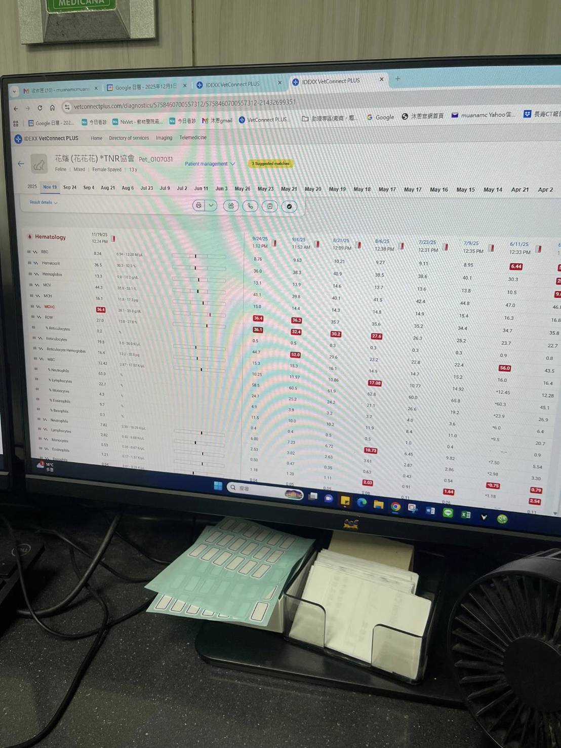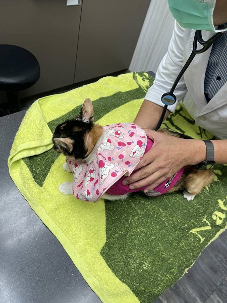 2025年3月25日花嬸突然沒有像往常一樣,拿掉頭套後就想舔,精神不好,頭套裡有嘔吐物,還有蹲便盆但沒有尿便,詢問沐恩後臨時回診,體溫稍微高一點,血檢結果沒有胰臟炎,但白血球升高了,X光檢查胸腹腔沒有發現異常,抽尿檢驗沒有發現細菌的感染情形,就先以腸胃炎治療,打皮下輸液及制酸止吐針劑,看診回到安養之家後,花嬸可能打過針有較為舒服些,有立刻吃飯,也沒有再嘔吐或異常的蹲砂盆行為,2025年4月2日回診追蹤,白血球已經降到正常值了,體重有維持,表示腸胃炎的問題有得到改善,只是血糖升高較多,需要多留意有無異常的多渴多尿。