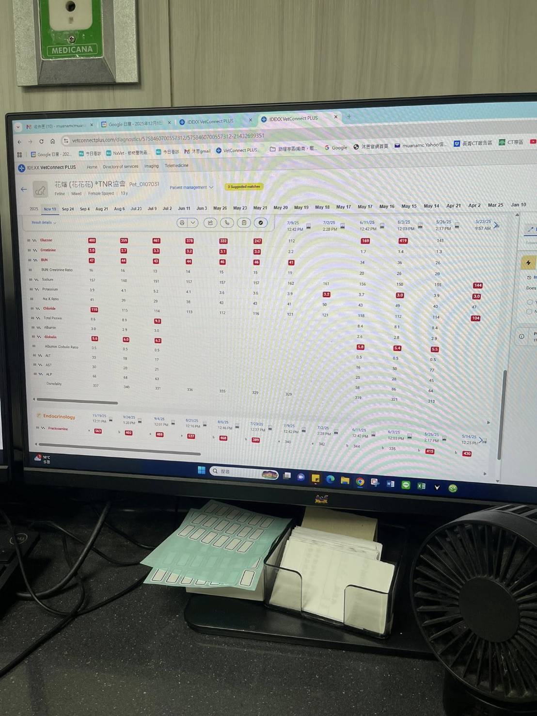 2025年5月14日照護員發現花嬸體重減輕多、食慾變差,回報沐恩後臨時回診,血檢結果,血糖及白血球都升高,紅血球指數雖在正常值但有脫水,腎指數crea正常、bun高於正常,幾項離子指數混亂,超音波檢查,胰臟腫大,脾臟也脹起來,根據檢查結果,應是三腺炎,血糖與胰臟相關,可能因此誘發糖尿病,醫師說明,如果血糖是因三腺炎升高,這樣是比較好的情況,代表只要治好三腺炎,血糖也就可以改善,但若糖尿病是單獨發生就比較不好,須住院治療,要打靜脈補水及打抗生素,隔日再開始打胰島素治療血糖