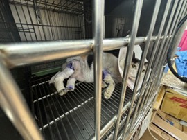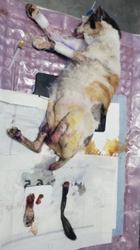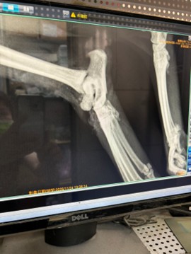 到醫院檢查驗血拍X光,左後腿關節骨折或脫臼、傷口很深,下半身有大面積挫傷、尾巴也有個深及見骨的傷口,血檢發現股指數破表、體溫36.5度偏低,先住院穩定生命跡象、清創、避免感染,骨頭的骨折或脫臼再觀察是否需要開刀