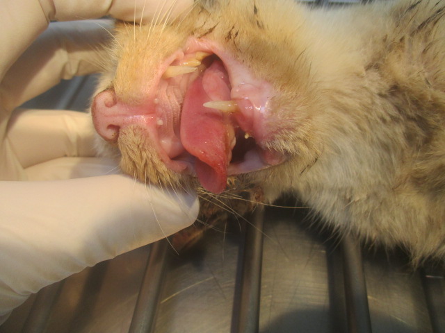 仔細查看,她的下巴向右歪斜,摸起來有一團硬塊,打開她的嘴巴發現她牙齒已掉光,只剩上下各一顆犬牙,下犬牙抵住舌頭,牙尖划破舌頭,為免舌頭被牙尖刺穿,請醫生將下犬牙拔掉,並請醫生檢查右邊舌下潰爛的部位是口炎或腫瘤