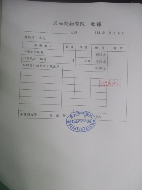 主題: 您的支持可以幫助美花度過安適平靜的貓生 申請者姓名: 王昀 花色: 申請日期: 2025-12-11 13:50:25 申請者部落格: 申請者臉書網址: 所在縣市/合作醫院: 台北市/恩加動物醫院 治療費用: 7800元 需求人數: 26人 已結案 (2026-03-09 02:45:35) 報名人員: lotterycat x10(已付款)、Mona x2(已付款)、李小萱(已付款)、Hikaru x3(已付款)、鴨鴨 x3、鴨鴨 x3、鴨鴨 x4(已付款)、小鼻孔 x5(已付款)、Hui Chieh Ku(已付款)、 候補人員: 動物病情說明: 美花是十幾歲的老貓,原本是漂漂亮亮的白底三花貓,兩個月前,她的右邊嘴角突然拖著長長的口水,右臉頰腫漲,無法吃東西,整支貓變得髒亂黏膩