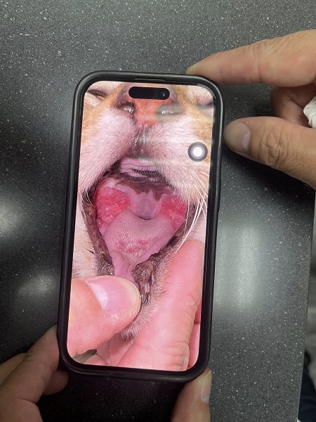 口腔檢查,一樣流口水症狀,口腔有紅腫,在沐恩施打干擾素。