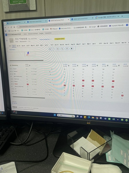 2025年7月21日,皮膚檢查,狀況OK。口腔檢查舌頭上有潰瘍且口腔有紅腫。今日進行胜肽治療,看能不能改善口炎與皮膚狀況。血檢部分指數都正常。