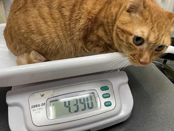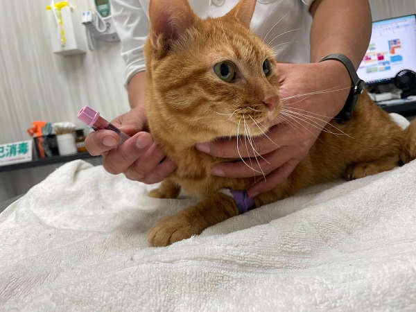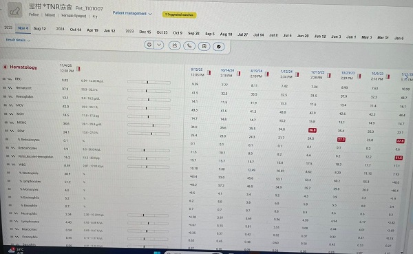 貓瘟病毒會嚴重傷害腸道黏膜,蜜柑的消化吸收功能都比常貓來得弱,體重增加緩慢、經常出現拉肚子情況,持續回診、吃抗生素及腸道保健品,在2022年4月間發情接受絕育手術,而腹瀉情況在持續用藥數月後有明顯改善,只是蜜柑的健康狀況極不穩定,2022年9月因發燒、食慾精神變差至沐恩醫院檢查結果,血檢紅血球下降、肝指數及白血球指數升高、X光的腎臟影像異常、超音波發現腹水、血檢A/G比指數很低,抽血後送實驗室的冠狀病毒PCR結果是陽性,加上血檢及臨床症狀,醫師認為腹膜炎的機率相當高,除了住院打靜脈,協會也立刻購買昂貴的腹膜炎保養品送往醫院給蜜柑服用,雖住院治療用藥後有好轉、可出院,但自此開始至2023年12月間,健康狀況還是反覆不定、幾度因為發燒、淋巴指數高、精神食慾差幾度住院治療,也持續吃昂貴的腹膜炎保健品。經過一年多的持續回診治療及用藥、吃完腹膜炎保健品療程,直到2024年1月間開始的定期回診,蜜柑的各項檢查結果才開始逐漸穩定,除了可逐漸減少用藥,只需吃肝臟保健品及食慾促進劑,也可延長回診時間。
