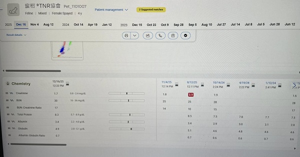 2025年8月12日回診追蹤,體重有增加,血檢結果除了腎指數升高其餘都正常,腎指數增加幅度有點多需兩個月後回診再追蹤。