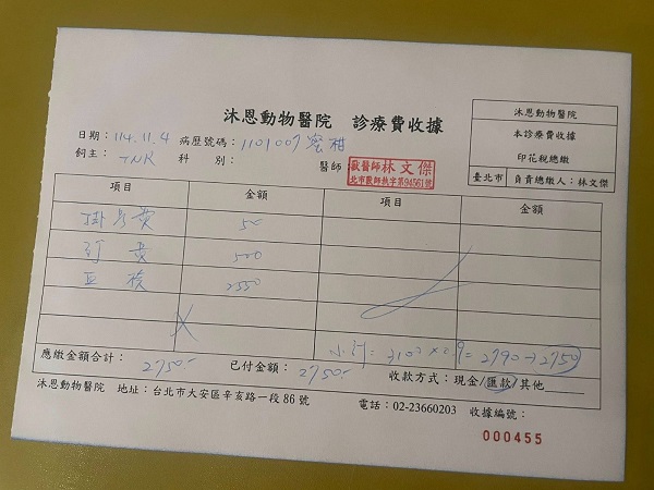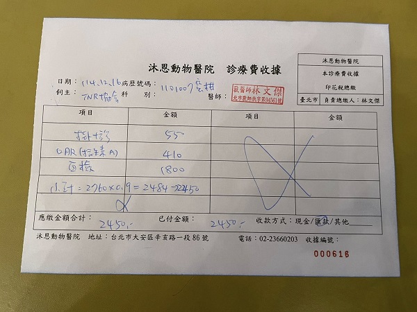 於2025年12月3日於沐恩進行牙周手術,此次共拔了一顆犬齒、一顆小齒、2顆臼齒,之前懷疑不好的增生,應是牙周病引起的增生,所以今日並沒有安排送檢驗。進行完手術後的蜜柑目前已順利恢復,關龍觀察的這一禮拜飲食也都良好,再於12月16日回診查看復原狀況,血檢皆正常,食慾也良好可以再多給一些蜜柑愛吃的食物以恢復體重,再多吃一周止痛加抗生素後即可停藥也無須回診。本筆醫助是蜜柑於2025年11月4日至2025年12月16日間於沐恩醫院的費用,包含回診,血檢,牙周手術及用藥的費用。