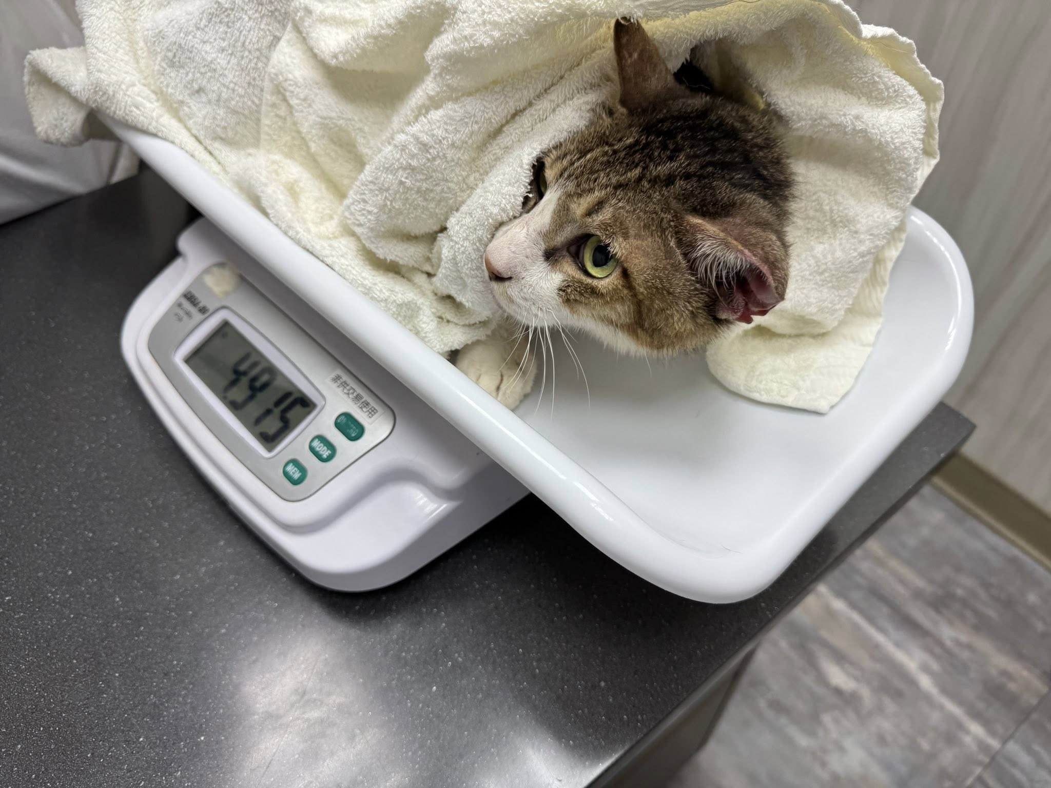 貓咪病情複雜,醫生們懷疑是腫瘤問題,於是7月初寫信向協會尋求幫助,目前已於合作醫院長青進行各項檢測,並於楊動物醫院住院照護中。經檢測,無腫瘤活躍細胞,細菌培養亦無細菌感染,已再進一步另做細菌切片染色檢測。第一階段報告結果,醫師認為,下巴跟頸部後側莫名腫大的原因,跟貓愛滋發病有關。目前投以抗生素、造血針治療中。