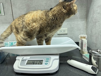 在2024年1月間阿咪因體型明顯變瘦,於2024年1月5日至沐恩醫院檢查,血檢結果腎指數及肝指數都高、有些脫水,口腔檢查發現左上犬齒牙齦腫起一包並有一個小傷口,X光檢查胸腔腹腔沒有明顯異常,整體檢查結果,主要是腎衰及牙周問題,只是在脫水及腎臟問題未處理好之前,不宜接受麻醉手術,所以先打皮下輸液、吃食促,二週後回診紅血球指數下降及磷上升指數,增加打造血針及吃降磷藥,治療至內科狀況較為穩定後,於2024年3月19日進行牙周手術,因腎指數仍是較高、麻醉手術不宜過長時間,所以手術只拔除狀況較差的四顆牙齒,完成牙周手術後仍持續回診治療肝腎指數問題,為了幫助阿咪的健康能更穩定,也開始做胜肽治療。