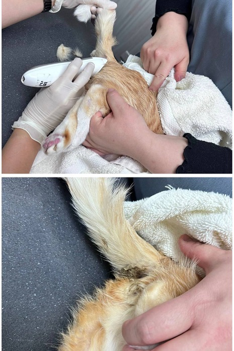屁股沾到大便,醫師幫忙剃屁股毛。有量肛溫38.7正常。