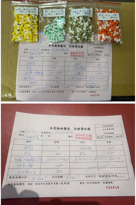 2026年1月7日於沐恩回診,血檢結果甲狀腺素偏高需持續追蹤觀察,因此甲亢藥加劑量,其他狀況及用藥持平。2026年2月初因糕糕連續兩天食慾下降且又吐又拉,因此安排2026年2月5日於沐恩醫院看診,體溫正常無發燒,超音波檢查發現腸道腫瘤有變大的趨勢,但病狀較像是腸胃炎與腫瘤無關, 左邊腎臟有新增疑似腫瘤影像需要再持續觀察,食慾下降部分先少量且分次灌食,因怕又會吐。在醫院已先施打了林格75+止吐制酸。本筆醫助是2026年1月27日至2026年2月5日間於沐恩醫院的費用,包含看診、血檢、超音波及用藥。