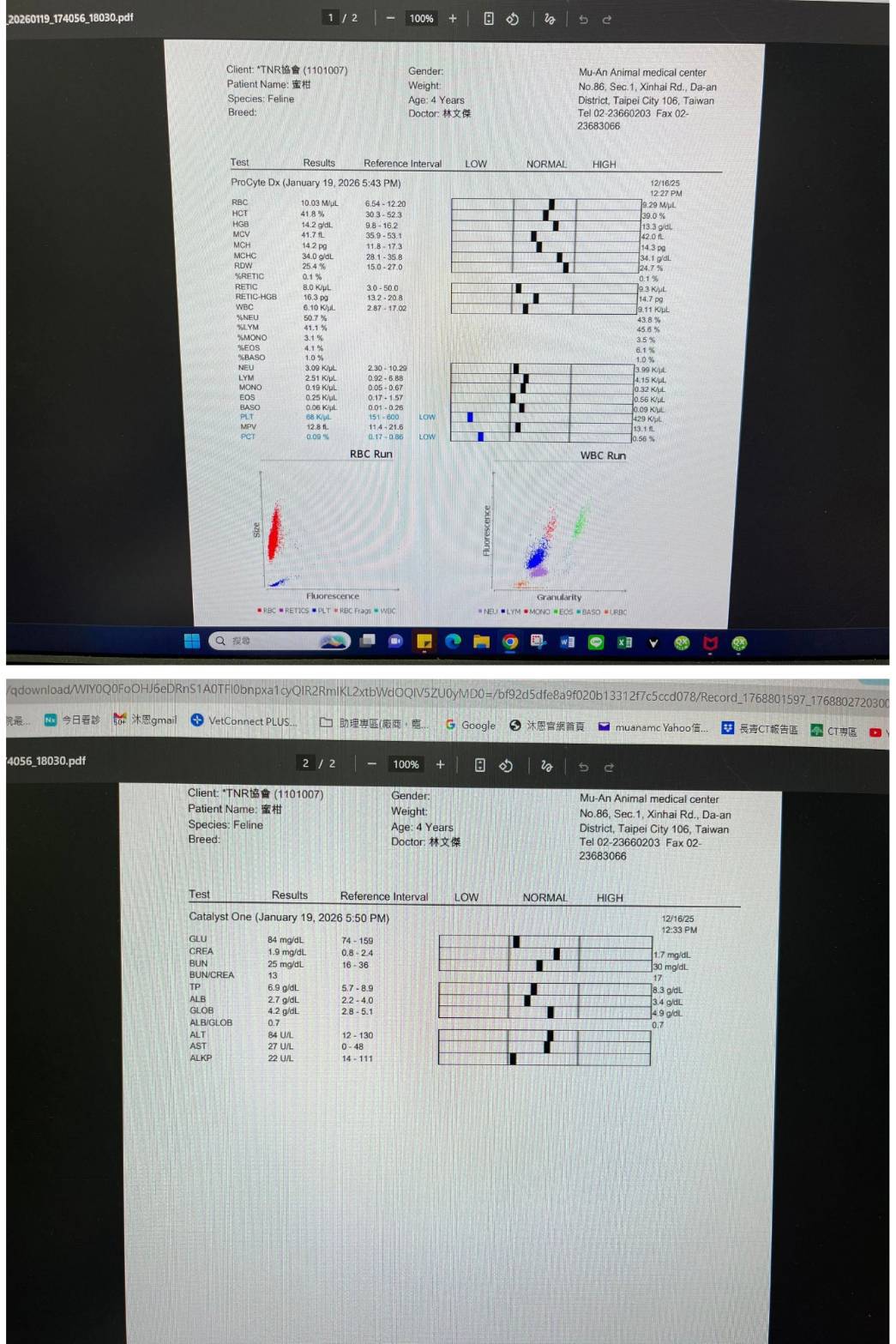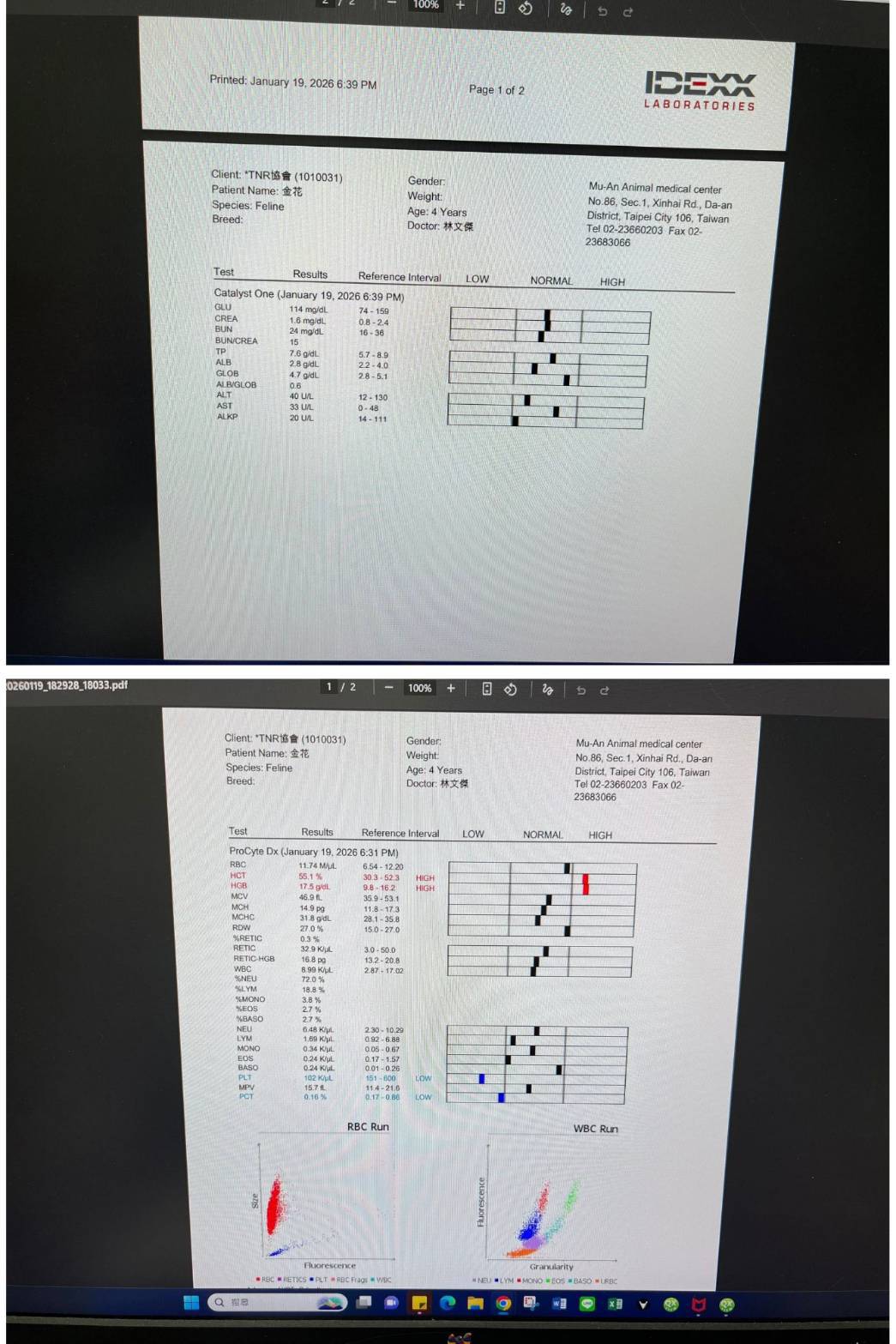 主題: 食慾不振且連續嘔吐的金花與蜜柑及一月部分醫藥用品 申請者姓名: TNR協會 花色: 申請日期: 2026-02-11 11:40:43 申請者部落格: https://www.facebook.com/SupportTNR/?locale=zh_TW 申請者臉書網址: https://www.facebook.com/SupportTNR/?locale=zh_TW 所在縣市/合作醫院: 台北市/沐恩動物醫院 治療費用: 10500元 需求人數: 35人 已結案 (2026-03-12 14:13:50) 報名人員: 1(已付款)、jacob(已付款)、Fafa x10(已付款)、嗚哩的噗哩(已付款)、懶懶熊愛貓貓 x2(已付款)、黑糖奶油大貓 x2(已付款)、波斯貓小娃(已付款)、Wei Yun Chang x5(已付款)、680(已付款)、陳春蘭(已付款)、Jasmine Lin(已付款)、Hanlin x2(已付款)、En Rong Shen(已付款)、Joanna Liu x2(已付款)、Ed Tsai x4(已付款)、 候補人員: 動物病情說明: <食慾不振嘔吐的金花>